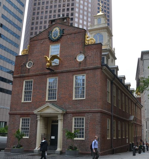 La Old State House (photo ci-dessus) est le plus ancien bâtiment public encore existant à Boston. Il fut construit en 1713 pour abriter les bureaux du gouvernement de la colonie de la baie de Massachusetts et se dresse sur le site de la première mairie de la ville datée de 1657 et qui brûla en 1711. La Old State House était l'endroit où l'on échangeait les nouvelles locales et d'ordre économique. Le sous-sol et le premier étage étaient alors loués par un marchand, John Hancock, qui y entreposait ses marchandises. La chambre du conseil du gouverneur royal était située à l'étage supérieur dans la partie est du bâtiment. On y fit de nombreux discours et des débats mémorables parfois contre la Couronne britannique. Le deuxième étage (zone centrale) était le lieu de rencontre de l'assemblée du Massachusetts, l'un des organismes coloniaux les plus indépendants. La galerie des visiteurs (disparue aujourd'hui) permettait aux citoyens d'écouter leurs élus et d'échanger lors de séances de questions populaires. L'extrémité ouest de la bâtisse hébergeait le tribunal du comté de Suffolk ainsi que la Cour suprême du Massachussets. Les proclamations officielles étaient faites depuis le balcon de la Old State House (côté est du bâtiment , donnant sur State Street, sur la deuxième photo ci-dessus). C'est en-dessous de ce balcon que se produisit, en 1770, le massacre de Boston ( des soldats britanniques tirèrent sur la foule vociférante). C'est aussi depuis ce balcon que fut proclamée la déclaration d'Indépendance le 18 juillet 1776. La Old State House servira aussi de siège pour le gouvernement du Massachussets avant que ne soit construit pour lui une nouvelle bâtisse sur Beacon Hill. De 1830 à 1841, la maison sera utilisée comme Hôtel de Ville. Puis en 1879, un groupe de citoyens de Boston fondèrent une association qui devint deux ans plus tard, une association bostonienne et fut à l'origine du musée d'histoire de la ville. Désormais coincée entre les gratte-ciel du centre ville, Old State House accueille le musée d'histoire de Boston, et est détenue par la ville.