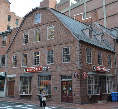 Entre Washington Street et School Street, se trouve la Old Corner Bookstore (ci-dessus). C'est l'une des plus anciennes constructions de Boston, érigée en 1712 par Thomas Crease qui en fit sa demeure. Il ouvrit ensuite une petite boutique d'apothicaire sur la façade donnant sur Washington Street. Le bâtiment qui s'élevait à cet endroit servit de maison à Madame Ann Hutchinson, connue pour ses réunions mémorables, en 1635, au cours desquelles des individus racontaient leurs expériences spirituelles. Cette dame voyait en chaque être humain une personne responsable de ses actes, ce qui déplaisait aux ministres puritains qui se voulaient uniques représentants de Dieu. Si bien qu'Ann Hutchinson fut bannie, de la colonie , en 1637, par la Cour Générale. Elle déménagea à Rhode Island, puis à New York, avant d'être tuée en 1643 lors d'un soulèvement amérindien contre les Hollandais. L'actuelle maison porta d'abord le nom de Crease puis de Manoir Brimmer. Le Docteur Samuel Clarke y vécut en 1816 et y ouvrit une boutique d'apothicaire au premier étage tout en restaurant la façade d'origine. En 1828, Carter & Hendee le remplacèrent et y installèrent une boutique puis une librairie (qui exercera une grande influence sur la vie littéraire de la nation). Ticknor & Fields s'y installeront également : Editeur de premier plan, il firent de l'endroit un lieu de rencontre informelle pour de nombreux auteurs connus. Laissée à l'abandon dans les années cinquante, la maison fut enfin restaurée en 1960. Une boutique est désormais vacante, si le cœur vous en dit...