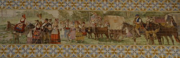 Il existe tout près de là une librairie célèbre et au décor unique: La librairie Lello. De style néogothique (ci-dessous), elle fut bâtie en 1906 par l'ingénieur Xavier Estèves, après la création de la société José Pinto Sousa Lello & Irmao (en 1881). Les points remarquables se trouvent à l'intérieur de la boutique: L'escalier majestueux en bois et les grandes fenêtres. Il est malheureusement interdit de photographier à l'intérieur. Ma visite tire à sa fin et je tiens à me rendre à la gare ferroviaire de San Bento (deuxième photo) qui a la particularité d'offrir de superbes azulejos représentant l'histoire des transports mais aussi les aspects ethnographiques de l'histoire du Portugal. C'est le peintre Jorge Colaço qui réalisa ces œuvres, en 1916, dans le grand hall de la gare ( qui fut érigée au début du XX ème siècle par l'architecte Marques da Silva). On peut observer entre autre une fresque représentant le Prince Henri à la conquête de Ceuta (troisième photo) mais aussi d'autres fresques....