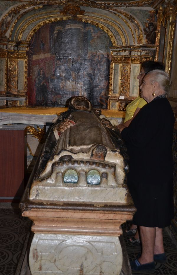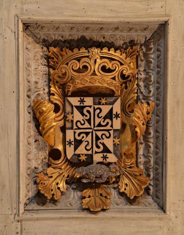 Ce pont qui enjambe la rivière Tamega, rejoint l'église Sao Gonçalo qui donne sur la Place de la République. On trouve le long de ce cours d'eau quelques bancs de pierre agrémentés d'azulejos. Pas de doute, nous sommes bien au Portugal. Je pénètre dans l'église et suis surpris par le nombre de visiteurs en ce début de journée. Je tombeau du saint attire les curieux (en photo ci-dessous) mais il faut se rendre dans le cloitre et lever les yeux pour apprécier les blasons qui s'y trouvent (deuxième photo). L'église qui date du XVI ème siècle a vu passer tellement de monde que l'image du saint qui ornait la chapelle a depuis disparu. L'église et le monastère forment un même ensemble et leur construction commença à partir de 1543 sur ordre du roi Joao III et de la reine Catherine. Trois styles architecturaux se mélangent dans cette construction: Le style Renaissance, le style baroque et le maniérisme.