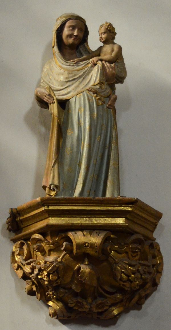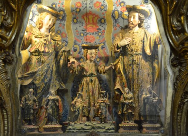 Je quitte sous le soleil cette charmante cité pour me rendre à Santo Tirso. Cette fois-ci, j'emprunte l'autoroute, toute proche. Connue pour son industrie textile, cette petite ville s'étend au bord de l'Ave. Fondée au VIII ème siècle par les Bénédictins, il reste encore de nos jours un ancien monastère. Le monastère de Sao Bento. Classé monument historique depuis 1910, cet édifice fut d'abord fondé par Lady Unisco Godiniz en l'an 978 (X ème siècle). En 1090, on construisit un nouveau bâtiment religieux qui ne sera achevé qu'au XV ème siècle. C'est Martim Gil, Comte de Barcelos qui en sera l'initiateur. L'église actuelle (ci-dessous) date du XVII ème siècle et fut érigée entre 1659 et 1679. On y voit de magnifiques sculptures en bois doré représentant des images liturgiques. La visite de celle-ci est particulièrement intéressante car on y trouve aussi des œuvres uniques, comme cette Vierge à l'enfant datant des XII-XIII èmes siècles et qui esquisse un sourire inhabituel (deuxième photo), ou encore cette représentation de la Sagrada Familia (troisième photo), pièce unique en Europe qui date du XVIII ème. Je tombe en arrêt devant le chœur dont le plafond laisse découvrir des peintures à fresque (quatrième photo). Un employé municipal dont j'ai fait connaissance sur le parvis de l'église me sert aimablement de guide. Il m'emmène dans une pièce non ouverte au public pour me montrer un tympan (cinquième photo) datant de la première église construite en 978. Plus de mille ans d'histoire se déroulent devant moi sous la forme de l'art roman avec d'un côté le soleil (cercle de gauche) et de l'autre la lune (à droite).