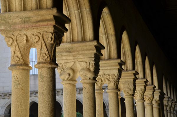 Une visite du cloitre (ci-dessous) s'impose avant de filer. Ses paires de colonnes gothiques datent du XIV ème siècle et sont ornées de chapiteaux richement décorés et tous différents, à l'aide de motifs du règne végétal et animique. Regardez-les bien ci-dessous (deuxième photo). Les autres bâtiments du monastère accueillent désormais l'école d'enseignement agricole de la ville ainsi que le Musée Abade Pedrosa où nous nous rendons maintenant.