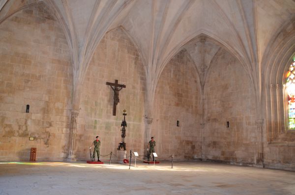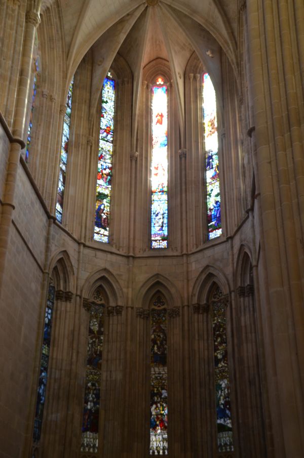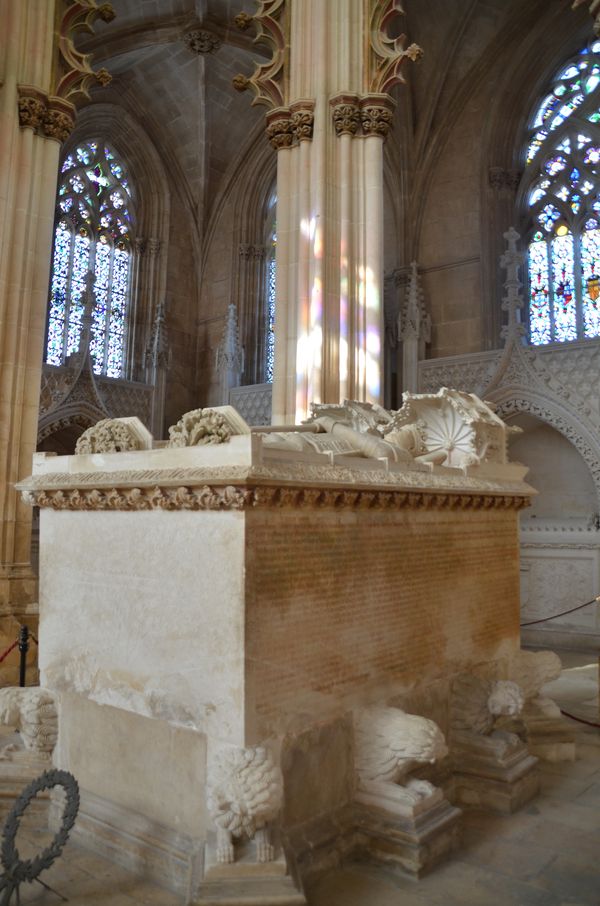 Huguet termina aussi le cloitre royal en garnissant notamment les arcades gothiques d'Afonso Domingues avec des remplages de style manuélin pour mettre en harmonie formes et décors. Ce cloitre est l'un des mieux réussis de l'architecture portugaise grâce à l'harmonie de ses dimensions et à la grande élégance du travail. Il compléta aussi la couverture de la salle capitulaire, en pariant sur une unique voûte dont les dimensions nous paraissent encore aujourd'hui surprenantes. Ce lieu de référence de la vie monastique, débuté par Afonso Domingues permet d'apprécier un vitrail (troisième photo) datant du XV ème siècle, constituant un grand tryptique dédié à la passion du Christ. Huguet eut ussi l'occasion de donner libre cours à son inspiration quant à la construction de la chapelle du fondateur (ci-dessous). Celle-ci accueille le tombeau du roi défunt et de Philippe de Lencastre, tous deux gisant main dans la main. Ce tombeau sera commencé en 1426 par le même Huguet. Il représente la première expérience portugaise d'un tombeau conjugal. Joao 1er y est représenté en armure complète, encore une autre innovation du modèle des gisants médiévaux portugais. Leur fils, Henri, le Navigateur, tout comme les princes Fernand, Pierre et Jean reposent aussi dans cette chapelle funéraire coiffée d'une magnifique lanterne octogonale. La devise de Jean 1er se trouve sur son tombeau: Pour le Bien.