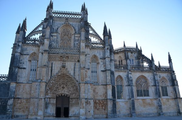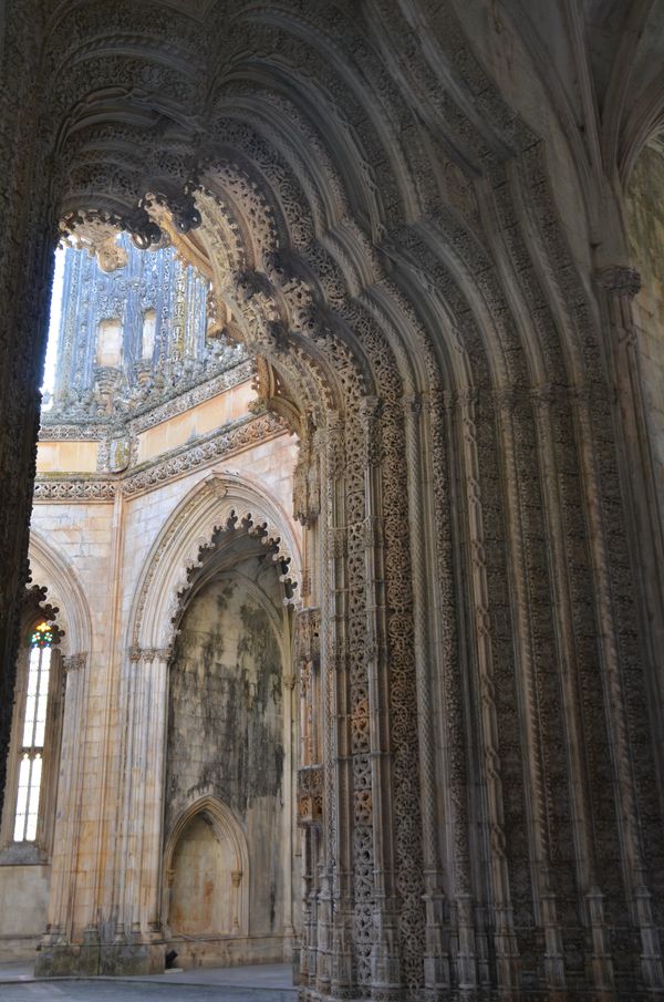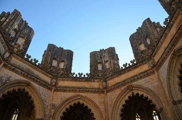 En 1383, Fernando 1er mourut sans héritier mâle direct. C'est donc Dom Joao, fils illégitime du père de Fernando, qui lui succède. Mais cela déplait à Juan de Castille qui conteste cet accession au trône. Le 14 août 1385, les troupes de Joao 1er, commandées par Nuno Alvares Pereira, défirent les Castillans sur un petit plateau situé près d'Aljubarrota, à trois kilomètres au sud de Batalha. La spectaculaire de Joao 1er assurera deux siècles d'indépendance au pays vis à vis de l'Espagne. Victoire spectaculaire et divine: Dom Joao avait fait le vœu d'élever une superbe église à la Vierge s'il gagnait la bataille. Ainsi naquit l'abbaye dominicaine de Santa Maria da Vitoria (en photo ci-dessous). Sa construction débuta en 1388 par l'architecte Maitre Afonso Domingues, auquel ssucèda David Huguet à partir de 1402 (c'est lui qui introduira le gothique flamboyant au Portugal). Les différents rois y laisseront par la suite leurs empreintes: Le fils de Dom Joao, le roi Duarte, commandera un panthéon derrière l'abside mais, abandonnées par le roi Manuel 1er, les chapelles resteront inachevées (deuxième photo), offrant tout de même leurs décorations de style manuélin. Conçues en forme de rotonde octogonale, l'endroit contient sept chapelles. On trouve dans l'une d'entre elles les restes mortels du roi Duarte et de son épouse. Moment unique de l'art de la Renaissance, le balcon des Chapelles imparfaites fut réalisé par Miguel de Arruda en 1533 et représente la dernière tentative d'achèvement de ces chapelles, de la part du roi Joao III.