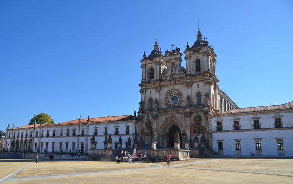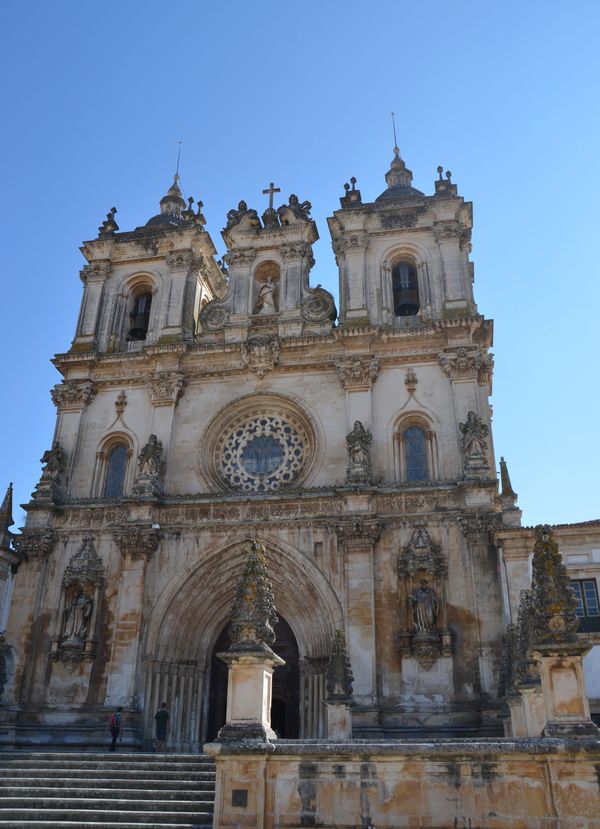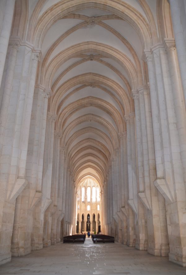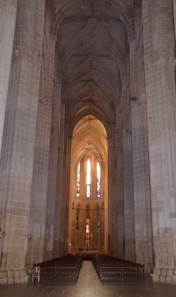 Afonso Domingues, le premier architecte, était l'architecte portugais qui jouissait de la plus grande aura pour que le roi Joao 1er lui confie une telle tâche. C'est lui qui conçut tout le projet, puis commença l'église (en photo ci-dessous), la salle capitulaire et les galeries sud et levant du cloitre du roi Joao 1er (deuxième photo). Son style d'architecture respecte les valeurs classiques et archaïques de l'époque. La nef centrale de l'église est l'une des plus grandes de tous les temps, et s'élève à 32,5 mètres de hauteur, hauteur amplifiée par des colonnes très denses qui forment un mur visuel continu en renforçant ainsi le sens ascensionnel de l'espace. La voûte d'arêtes, avec de grandes clefs décorées est due à Huguet, qui introduira les lignes évoluées du gothique tardif. Il achèvera les travaux entamés par son prédécesseur en lançant les voûtes et en dessinant le programme de la façade principale (troisième photo) avec un portail d'une iconographie resplendissante. On trouve sur les montants du portail les apôtres conduisant vers le Christ, son image étant étalée sur le tympan et entourée de quatre Evangélistes tandis que les archivoltes sont ornées de vierges, de martyres, de papes, d'évêques, de rois de Juda et de prophètes.