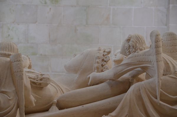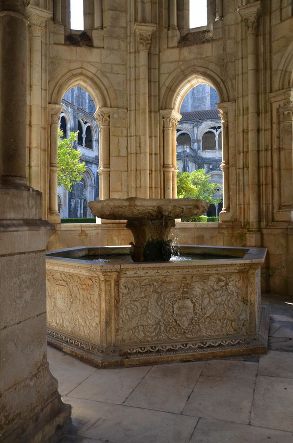 Les yeux remplis de ce lieu éblouissant, je reprends le volant pour me rendre au monastère d'Alcobaça (première photo). Inscrit aussi au patrimoine de l'UNESCO, ce monastère est la plus grande abbaye du Portugal et doit sa renommée à la simplicité de son architecture médiévale. Sa fondation en 1153 est liée à l'arrivée dans le pays de l'ordre de Citeaux en 1138, et à la naissance de la nation portugaise. En mars 1147, le roi Afonso Henriques conquit le bastion maure de Santarém et fit vœu d'ériger une église pour les cistersiens. Achevée en 1223, elle sera agrandie par d'autres souverains: Le roi Dinis fera élever le cloitre principal (deuxième photo ci-dessous). Ce cloitre, surnommé aussi cloitre du silence, se trouve au centre du monastère médiéval , et est un passage obligé situé à l'intersection des dépendances de l'édifice. On y trouve un lavabo octogonale (troisième photo) qui servait aux moines à se laver les mains avant de se rendre au réfectoire juste en face. On trouve enfin dans ce cloitre une statue en pierre polychrome (du XVI ème) représentant N.D du Cloitre. L'église abrite les tombeaux du roi Pedro et de sa maitresse Inès (quatrième photo). En effet, pour des raisons d'état, Dom Pedro (fils de Dom Afonso IV) avait du épouser l'Infantede Castille, Constança, alors qu'il était tombé amoureux de l'une de ses dames d'honneur, Inès de Castro. A la mort de Constança, Dom Pedro partit vivre à Coimbra avec Inès. Mais, jugeant la famille d'Inès trop dangereuse pour le royaume, Dom Afonso IV la fit assassiner le 7 janvier 1355. A la mort de son père, Dom Pedro fera arracher le cœur aux meurtriers de sa belle et, ayant révélé son mariage secret avec Inès, fera exhumer sa dépouille et la fera couronner, tout en contraignant la cour à baiser la main de la reine morte.
