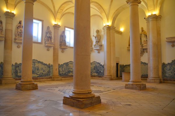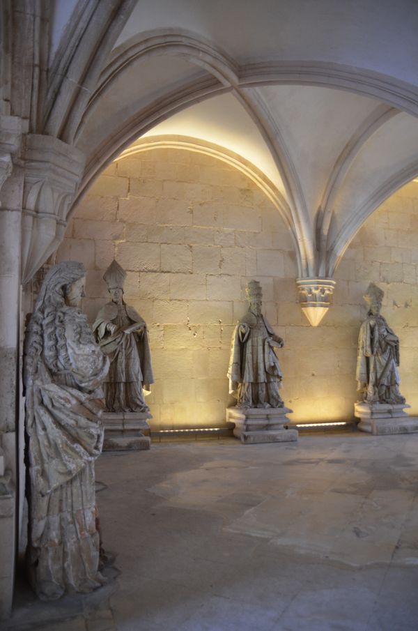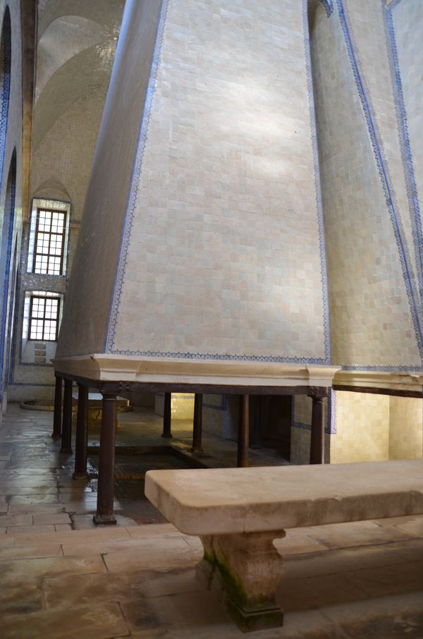 J'arrive maintenant dans la Salle des Rois (ci-dessous). Endroit érudit et austère, cette ancienne chapelle accueillit à l 'époque baroque, les statues des rois du Portugal (seuls les trois Philippe sont manquants!) tandis que les murs sont ornés d'azulejos contant la légende de la fondation du monastère. L'endroit présente enfin une allégorie du couronnement du roi Afonso Henriques par le Pape Alexandre III et Saint Bernard. On attribue cette sculpture aux moines. Le réfectoire est l'un des espaces médiévaux les mieux conservés. Un portail porte l'inscription:Considère que tu manges les péchés du peuple. L'endroit est formé de trois nefs de dimensions et de hauteurs identiques ce qui permet une harmonie spatiale. Juste à côté se trouve la cuisine (deuxième photo) dont l'escalier de droite offre un accès direct avec le dortoir (en cas de petit creux des moines la nuit?) et qui possède une cheminée de style baroque exceptionnellement grande. L'originalité de ce lieu se trouve dans acheminement de l'eau courante: Un réservoir d'eau était intégré dans le système hydraulique savamment mis au point par les moines. L'eau provenant de la Levadinha, un bras de la rivière Alcoa, artificiellement creusé par les moines pour l'alimentation du monastère.