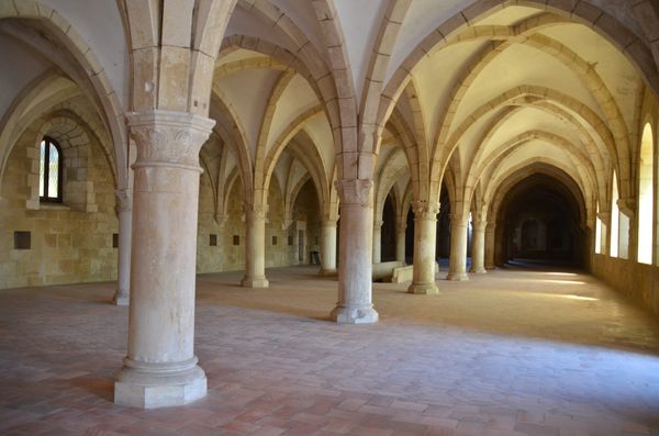 Le dortoir (ci-dessous) est l'un des plus anciens espaces du monastère. On remarque immédiatement la grande longitude (67 mètres) de ses nefs qui insiste sur l'austérité de l'idéal cistercien, impression renforcée par des colonnes basses et brutes d'où sortent les voûtes. La Salle du Chapitre servait quant à elle aux moines pour discuter des sujets de la communauté et pour administrer le monastère. C'est là que se déroulait quotidiennement la lecture du chapitre de la loi. Les postulants y postulaient leurs vœux et on y entendait les moines en confession. Une décision de 1180 imposa l'inhumation de tous les abbés dans cette pièce (deuxième photo).