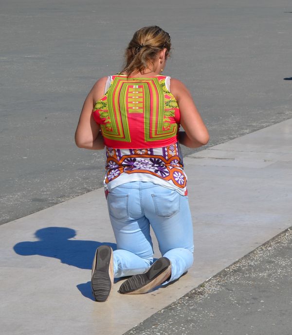Fatima attire aujourd'hui les croyants des quatre coins du monde et ils sont nombreux en ce dimanche. Certains se déplacent à genoux en faisant des prières (ci-dessous). Cette pratique populaire date de la première guerre mondiale durant laquelle on demanda aux habitants de faire des sacrifices. Je renonce à me rendre à la Chapelle des apparitions tellement il y a foule. Je ne me sens pas à l'aise parmi cette affluence parfois trop sollicitée par un mercantilisme exacerbé. L'imposante basilique, dont la construction débuta le 13 mai 1928, s'élève, dans un style néo-classique, avec sa tour de 65 mètres surmontée d'une croix (deuxième photo) et entourée de colonnades (troisième photo). A l'intérieur, une foule se presse pour apercevoir et photographier les tombes des trois jeunes bergers témoins des apparitions de la Vierge.
