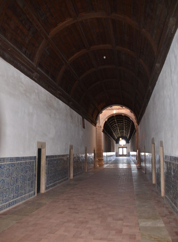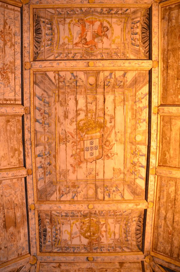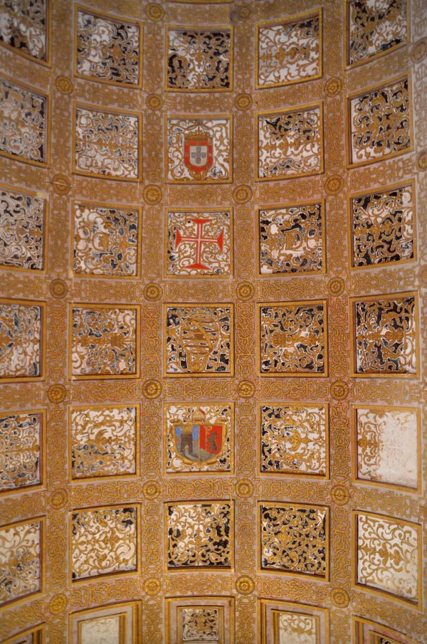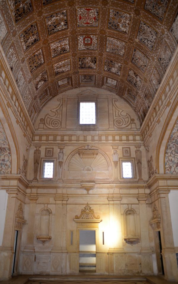 Les constructions intervenues de 1531 à 1552 opérèrent un profond changement architectural. La modernisation des espaces retranscrit les souhaits du Frère Antoine de Lisbonne, adepte du schéma de la Ville de Dieu (selon Saint Augustin) et de l'édification de la connaissance (selon Saint Jéronimo). Le cloitre principal (en photo ci-dessous), conçu par Jean de Castille en 1530-33, fut alors partiellement démoli puis remplacé par celui que nous connaissons aujourd'hui sur un projet de Diogo de Torralba réalisé pour l 'essentiel en 1562. Ce cloitre, qui subira les retouches de l'architecte italien Filipe Terzi à la fin du XVI ème, est considéré comme une œuvre maitresse de la Renaissance. Durant le seconde moitié du XVI ème siècle, le couvent du Christ subira encore des transformations, avec l'ajout de nouveaux bâtiments: Felipe I fut à l'origine de l'achèvement du cloitre principal et de la mise en œuvre d'un aqueduc hydraulique unique en son genre pour l'époque. Il initia aussi la construction de la nouvelle sacristie (deuxième photo) de style maniériste. C'est Francisco Lopes qui fut chargé de sa réalisation, en lieu et place de l'ancienne maison du Chapitre (sous le règne de Dom Henrique). On retrouve ainsi les innovations stylistiques apportées par l'architecte de l'Ordre, Diogo Marques Lucas (dont le superbe plafond sur la troisième photo).