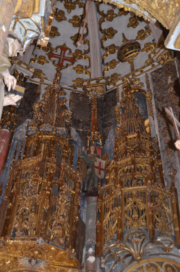 Fondé en 1160, nous l'avons vu, le Couvent du Christ (ci-dessus) est un ensemble de bâtiments différents, qui domine la cité de Tomar. Sur 45 hectares au total, l'édifice du couvent proprement dit ainsi que le château des Templiers n'occupent que cinq hectares, y compris la muraille datant de la première moitié du XVI ème. Le couvent du Christ est un des édifices les plus importants du Portugal, inscrit au patrimoine mondial de l'UNESCO depuis 1983. Gualdim Pais est à l'origine de la construction du château des chevaliers du Temple de Tomar, en 1160. Croisé portugais et chevalier du roi Alphonse 1er du Portugal, il combattra les Maures aux côtés du roi et sera fait chevalier en 1139 après la bataille d'Ourique. Il partira peu de temps après pour la Palestine où il combattra comme chevalier templier et jouera un rôle important dans le siège de Gaza. En 1157, il devient le quatrième maitre de l'ordre dont le siège est alors à Braga. Il mourra à Tomar en 1195 et sa sépulture se trouve dans l 'église de Santa Maria do Olival (ci-dessous).