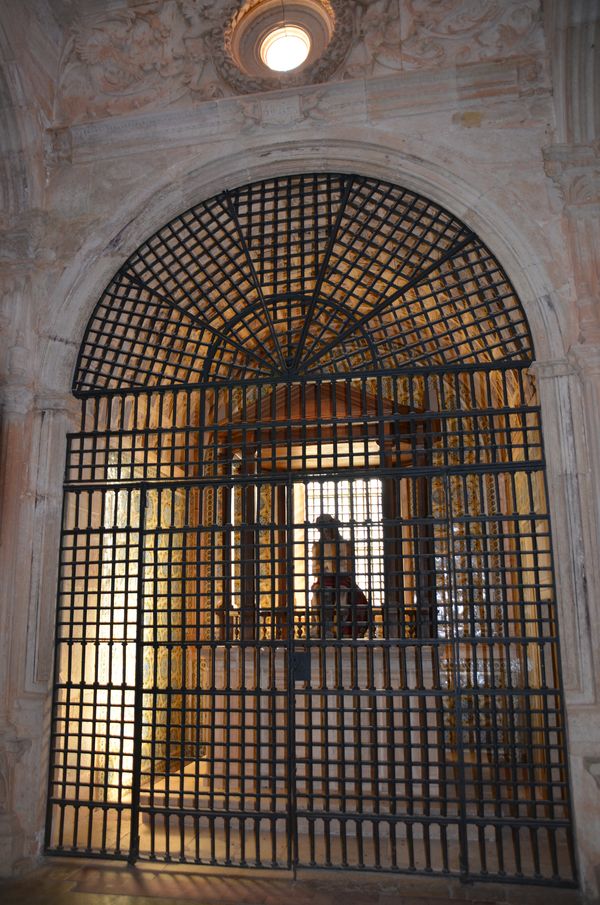 Des découvertes archéologiques montrent que le site de Tomar avait déjà été occupé par les Romains. CE fut aussi un lieu occupé par les Arabes avant la Reconquête au XII ème siècle. La partie centrale du Couvent est construite en forme de rotonde (ci-dessous) représentant un temple fortifié de la deuxième moitié du XII ème. L'architecture de l'édifice est directement influencée par la rotonde du Saint Sépulcre qu'on trouvait à l'époque à Jérusalem, du temps des Croisades. La Charola (deuxième photo) est un temple primitif de style roman du XII ème siècle qui fut transformé en église. Au XVI ème siècle, peintures et retables furent rajoutés ainsi que des statues, ce qui offre encore aujourd'hui un décor superbe. Cet endroit était l'oratoire des Templiers, et le cœur du monastère. C'est pourquoi les décorations devaient refléter la richesse de l'ordre.