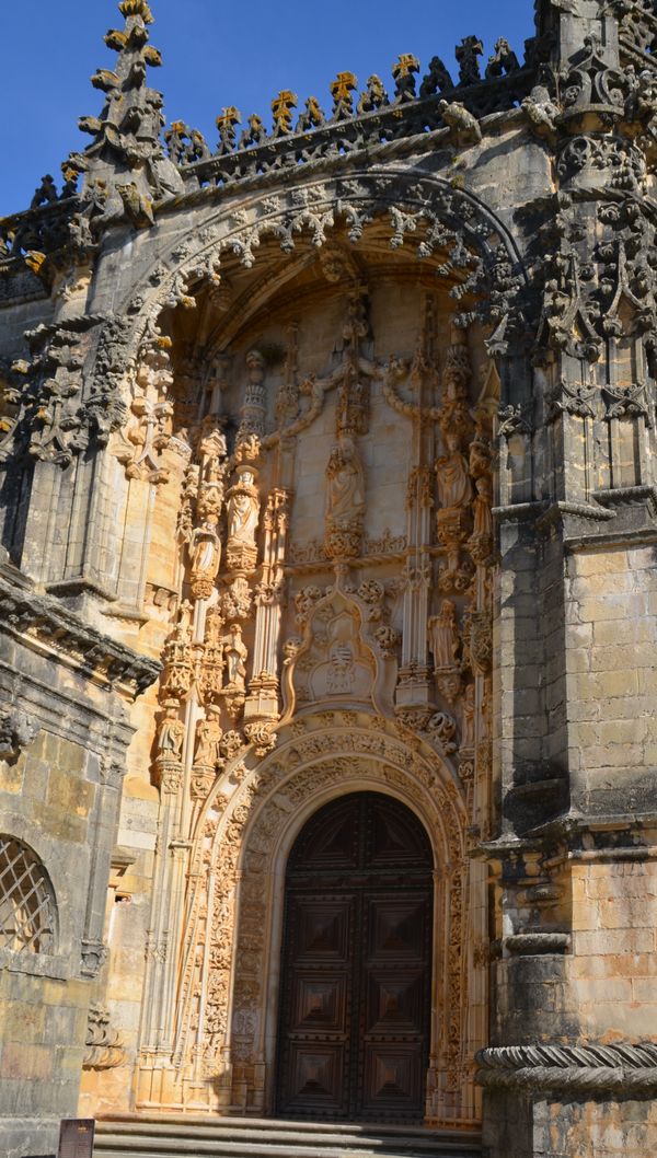 L'endroit connut de nombreuses transformations entre les XII ème et XVI ème siècles, laissant apparaître le style gothique. Aux bâtiments purement militaires déjà existants, on ajouta bientôt les cloitres gothiques du cimetière (première photo ci-dessous) et des ablutions (deuxième photo). A cette époque, l'infant Dom Henrique, le fils de Dom Joao I était l'administrateur et le gouverneur de l'Ordre du Christ. Erigé par Fernao Gonçalves, le cloitre du cimetière servait de lieux de processions mais aussi de dernière demeure pour les frères chevaliers. Il fut remanié au XVII ème. Quant au cloitre des ablutions, il fut bâti sur deux niveaux et sa construction commença autour de 1426 pour se terminer en 1453. C'est là que les profanes, serviteurs sans ordre religieux, effectuaient les travaux domestiques. La ville basse de Tomar, d'origine médiévale, prit son essor grâce au repeuplement qui eut lieu du XIII ème au XV ème siècle. Le Roi Manuel Ier ordonna la construction d'une nouvelle église de style gothique, et de taille rectangulaire conformément au plan biblique de Salomon. C'est Diogo de Arruda qui supervisa les travaux, relayé ensuite par Joao de Castillo. C'est à Diogo de Arruda que l'on doit l'exubérance du portail sud (troisième photo) ainsi que des fenêtres de la Salle du Chapitre, parfait exemple du style manuélin. Le roi Joao III, lui, fera de ce lieu un monastère fermé sur lui-même. De nouvelles dépendances seront alors ajoutées, l'ensemble s'organisant autour de six cloitres, dont deux jouaient le rôle de passage et d'hygiène ( Cloitres des commodités).