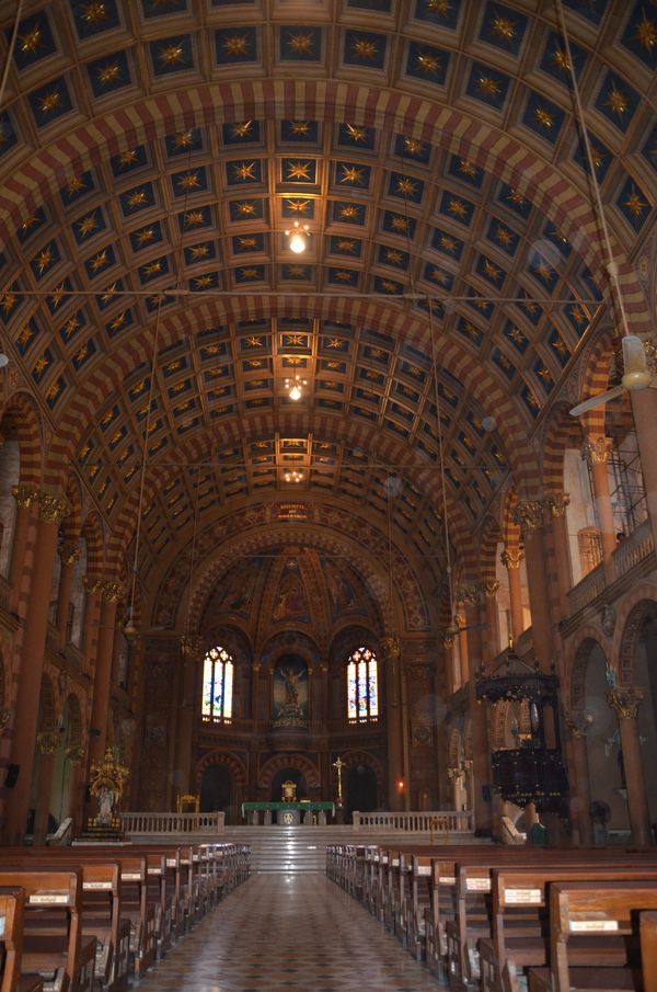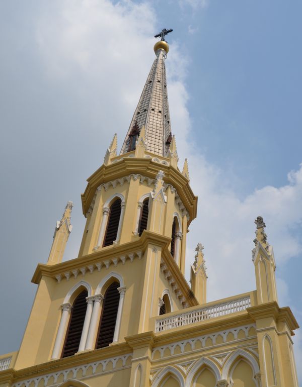 Non loin de là, je me rends à la Cathédrale de l'Assomption (ci-dessus). Cette superbe construction de style Renaissance a une longue histoire et est considérée comme un lieu important pour la communauté catholique de Thaïlande. C'est aussi le siège de l'archevêché de Bangkok. L'histoire de l'édifice remonte à 1820, sous le règne de l'évêque Florens qui se trouvait alors à la tête de la »Mission du Siam ». On fit l'acquisition d'un terrain et on y construisit une église en l'honneur de la Vierge Marie avec les dons de fidèles. Cette petite église de style thaï fut achevée en 1821 et on lui donna le nom d'église de l'Assomption. Tout près de l'église, on bâtit la demeure de l'évêque et un an plus tard, l'église prit le statut de cathédrale, et devint depuis le siège du diocèse de Bangkok. En 1909, la petite église, devenue trop petite nécessita l'érection du bâtiment actuel, avec le concours d'un architecte français : On utilisa les matériaux locaux disponibles mais le marbre des décorations intérieures fut importé d'Italie et les vitraux, de France. Après neuf années de travaux, la cathédrale allait être baptisée le 15 août 1919 par l'évêque René Perros. On retrouve le style Romanesque à l'extérieur de l'édifice : Les deux tours d'une hauteur de 32 mètres sont parfaitement symétrique tandis que le toit culmine à 25,6 mètres.