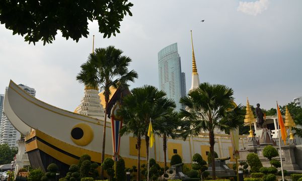 Le temple bouddhiste Wat Yannawa (en photo ci-dessus), lui, est situé dans le district de Sathon sur la rue Charoen Krung. C'est un temple ancien datant de la période Ayutthaya (signifiant « qui ne peut être conquis »). Ayuthhaya est avant tout la capitale de la province du même nom. La ville fut fondée en 1350 par le roi U-Thong et devint la capitale de son royaume (connu également sous le nom d'Ayutthaya). Elle fut pillée par les armées birmanes en 1569 puis détruite par les mêmes armées en 1767. Les ruines constituent aujourd'hui le parc d'Ayutthaya où on retrouve d'anciens temples similaires (wat) sur une quinzaine de sites. Revenons sur l'originalité du temple Wat Yannawa qui réside dans sa jonque : Celle-ci fut érigée pour symboliser les bateaux à voile étrangers venus dans le pays. La Thaïlande commerçait autrefois beaucoup avec les étrangers, dont les Portugais.Le temple fut érigé par le roi Rama III il a environ 470 ans afin de rendre hommage à ces bateaux étrangers ayant apporté la prospérité à son pays. La jonque seule mesure 43 mètres de long. Deux stupas se hissent en lieu et place des mâts, tandis que deux énormes yeux figurent sur la proue et sont supposés éloigner les esprits malfaisants. 220 moines de tous âges résident dans le temple et accueillent chaque jour un grand nombre de visiteurs qui viennent ici pour prier, méditer et chanter. Lors des cérémonies on peut compter entre mille et deux mille visiteurs par jour.