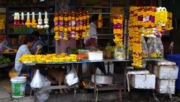 Le dernier temple de ma promenade s'appelle Temple Sri Maha Mariamman. Je suis d'abord attiré par les sculptures des lieux (ci-dessus) qui me font penser à l'Inde. Or, ce lieu est un petit morceau du continent indien : Bâti par les Tamouls du quartier en 1879, ce temple hindou est dédié à la déesse Uma Devi et rendait presque austères les temples bouddhistes face à ce dette richesse de sculptures colorées. En guise de portails se dressent deux gopura de six mètres, qui arborent les effigies de divinités polychromes. Dans l'architecture des temples hindouistes, le gopura est en effet une construction par laquelle on pénètre dans les enceintes successives d'un temple et ressemble à une tour monumentale très richement colorée. Dans la rue, de simples étals débordent d'offrandes (troisième photo ci-dessus).