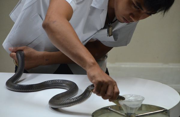 Une autre curiosité vaut la peine d'être vistée dans le quartier de Silom : La ferme aux serpents (ci-dessus). Celui qu'on appelle ici l'Institut de la Reine Saovabha s'est en effet spécialisé dans l'élevage de serpents venimeux et l'extraction de venin de ces serpents, attraction devenue depuis très populaire auprès du public ( deuxième photo ci-dessus). Cet institut fut créé en 1912, lorsque le roi Rama VI accorda l'autorisation de mettre au point puis de distribuer un vaccin contre la rage, sur une idée du Prince Damrong ( sa fille, la Princesse Banlusirisarn, était morte de la rage). Inauguré officiellement le 26 octobre 1913, puis rebaptisé en 1917 sous le nom d'Institut Pasteur ( en hommage à celui qui avait découvert en premier le vaccin contre cette maladie). L'institut produisit aussi le vaccin contre la variole par la suite. Dans les années 1920, le roi offrit une de ses propriétés située sur la rue Rama IV afin d'y bâtir de nouveaux immeubles qui seront inaugurés en décembre 1922 et baptisés du nom de la Reine Saovabha (la mère du roi). Puis, le Docteur Léopold Robert sollicita les étrangers vivant en Thaïlande afin de collecter des fonds pour ouvrir une ferme de serpents et permettre ainsi à l'institut de fabriquer un sérum antivenimeux permettant de lutter contre les morsures de serpents. Deuxième ferme de ce genre au monde (après celle de Sao Paulo au Brésil), celle-ci ouvrit ses portes le 22 novembre 1923 en présence de la reine Savang Vadhana, alors présidente de la Croix Rouge thaïlandaise. Développer la recherche sur le venin de serpent était important car de nombreuses personnes sont mordues par ces animaux en Thaïlande. Cette ferme offre de voir 190 sortes de serpents ( dont 61 sont venimeux) tant dans les jardins que dans le serpentarium. Ce dernier permet d'observer 35 espèces de serpents ( principalement des espèces thaïlandaises) dont des animaux très venimeux et d'autres non venimeux. C'est dans ce bâtiment qu'a lieu, deux fois par jour, l'extraction de venin en présence du public. Au premier étage, le visiteur découvrir l'histoire de cet animal, sa reproduction, son anatomie, les effets des venins et leurs traitements. Une exposition qui ne manque pas de piquant !