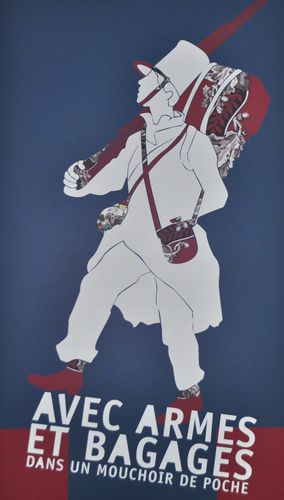 L'image de notre armée a bien changé : Professionnalisée, elle intervient maintenant sur des théâtres extérieurs compte tenu de la paix qui règne en Europe depuis soixante années. Mais cela n'a pas toujours été le cas et il peut être intéressant de se replonger dans son histoire afin de mieux comprendre ce qu'était l'armée autrefois. C'est le thème de l'exposition « Avec Armes et Bagages...dans un mouchoir de poche » qui se tient actuellement au Musée des Armées (Paris Invalides). Le projet a vu le jour après que le Musée de l'Armée ait été partenaire, en 2009, de l'exposition Mito e Bellezza qui fut organisée par les musées napoléoniens de l'île d'Elbe et de Rome. C'est un genre inédit d'exposition sur la société française et sur la place des militaires en son sein à la fin du XIX ème-début XX ème siècles (tout particulièrement de la guerre franco-prussienne de 1870-71 jusqu'au déclenchement de la première guerre mondiale en 1914) que nous allons découvrir. Son ambition est de transmettre au public le plus large l'histoire militaire de la France, tout en faisant connaître et comprendre l'organisation de l'armée, le rôle et la condition du soldat, la relation que celui-ci entretient avec la société civile. En effet, le visiteur est invité à suivre le parcours surprenant du soldat, de sa vie quotidienne, ainsi que celle de la société française, au gré des avatars d'un objet à la fois étonnant et méconnu : Le carré de textile imprimé, appelée mouchoir puis foulard.