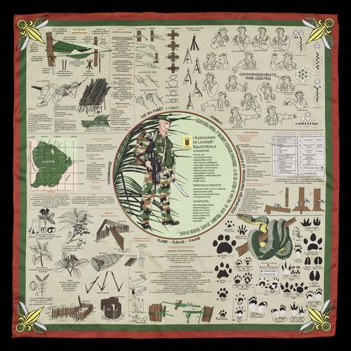 Lors de la première guerre mondiale, en 1914, les mouchoirs portaient des motifs militaires traités de façon moins réaliste, moins explicite mais plus symbolique et stylisée. Lors de la seconde guerre, en 1944, les foulards en soie comportent toujours ces motifs militaires mais servent avant tout à transmettre et à conserver des données techniques, notamment aux troupes aéroportées qui emportent avec elles un foulard représentant une carte de France pour parachutistes. Au XX ème siècle, le carré devient un des impératifs de la mode et de la haute couture. A la fin du XX ème, et au début du XXI ème siècle, la tradition du mouchoir imprimé et de son rôle didactique ressurgit au sein des armées. L'objet prend alors une résonance commémorative, voire nostalgique. La galerie d 'exposition permet entre autre d'admirer un mouchoir de la Légion étrangère ( en photo ci-dessus) qui fut offert en 2007, en guise de cadeau de noël, par le Colonel chef de corps du 3 ème REI (Régiment étranger d'infanterie) de la Légion à ses soldats : On y trouve un guide de survie en environnement hostile (installation d'un campement, soins aux blessés, comment communiquer, pêcher, et reconnaître les animaux et les plantes...) et quelques symboles de la Légion étrangère dont ces grenades à sept flammes à chaque coin du foulard, la devise en latin Legio Patria Nostra et les couleurs rouge et vert qui bordent le carré ( ces couleurs étaient représentatives de l'uniforme des soldats suisses qui furent nombreux à rejoindre la Légion étrangère, à sa création en 1831 et elles furent depuis conservées).