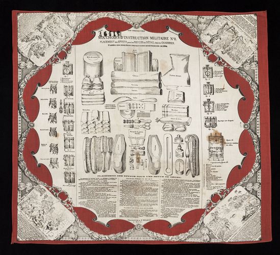 Parmi les symboles des états-nations, on compte notamment le drapeau, véritable outil de communication sur un champ de bataille : Sa taille et ses couleurs le rendent visible par tous les temps et il est à la fois un point de repère pour les soldats et l'honneur du groupe auquel ils appartiennent. Quant au mouchoir, il n'est plus seulement imprimé de motifs décoratifs. A partir du XIX ème, on y trouve aussi des images narratives, complétées par des textes. D'abord réservé au traitement de l'actualité politique, il s'adapte peu à peu à la clientèle populaire en y diffusant des informations sur le jardinage, la cuisine, l'hygiène et les premiers soins...et devient un support didactique au même titre que l'almanach ou le manuel, bien avant de concerner l'armée. Il participe ainsi à l'instruction des jeunes recrues en utilisant des mouchoirs d'instructions contenant des impératifs et des consignes divers comme l'apprentissage de la géographie, le soin à un blessé ou le cirage des chaussures.