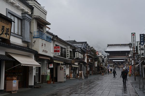 Mon premier contact avec Nagano est cet autobus anglais insolite aperçu au centre ville ( sur l'avenue conduisant au temple Zenkoji) et transformé en bar-restaurant. J'y ferais une pause salutaire après ce long voyage. Que dire de Nagano City? Son emblème est la fleur de pommier ( on trouve de nombreuses spécialités à base de pomme dans cette ville), son arbre est l'arbre de Shimano et la cité contient environ 390 000 habitants. Capitale de la préfecture de Nagano, celle-ci accueillit en 1998 les Jeux olympiques d'hiver mais il ne reste guère de souvenirs apparents de cet événement aujourd'hui, excepté une stèle rencontrée sur ma route vers le temple Zenkoji ce matin. Ce célèbre temple bouddhiste du VII ème siècle avait alors donné lieu à l'apparition d'un petit village en contrebas de celui-ci et face à lui: Ce petit village est désormais devenue une ville, Nagano-City. On la surnomme pour cette raison « Monzen-Machi » car la ville fut créée en face de la porte Niomon du temple. Face à cette porte d'entrée (ci-dessous) se trouve une avenue pavée ( les pavés sont considérés comme l'un des trésors nationaux depuis 1997) bordée de boutiques, de restaurants et d'hôtels qui reçoivent les pèlerins de tout le pays (troisième photo). J'ai de la chance car la neige qui avait commencé à tomber tôt ce matin a fait une trêve. Le ciel bleu et le soleil referont même leur apparition en cours de matinée.