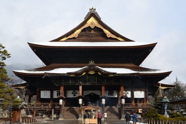 C'est en 644 qu'est construit le temple bouddhiste Zenkoji (l'un des trésors nationaux japonais) autour duquel le village se développera, sous le règne de l'empereur Kimmei. L'endroit voit croitre son influence religieuse et le village prospère grâce au commerce. Le temple sera déplacé à plusieurs reprises avant d'atteindre son emplacement actuel, un ancien village appelé Motozen. A l'époque de Kamakura, d'autres temples japonais copièrent la fameuse statue de Bouddha du temple Zenko-ji. Durant la période Sengoku, l'abbé en chef, craignant que le temple ne soit brûlé durant lors des combats, en fit construire une réplique à Kofu ( préfecture de Yamanashi). En 1598, Toyotomi Hideyoshi (le second des trois unificateurs du Japon) déplaça même l'hibutsu à Kyoto. Cet hibutsu ainsi que le temple rejoindront plus tard Shinano. Le temple Zenko-ji constitue l'un des derniers sites de pèlerinage du Japon, qui tient peut être sa célébrité des combats entre Uesugi Kenshin (seigneur de guerre nippon) et Takeda Shingen durant le XVI ème siècle. C'est en effet ce temple qui servit de camp de base pour les opérations de Kenshin. Le temple Zenko-ji fut aussi fondé avant que n'apparaissent dans le pays différents écoles bouddhistes. On retrouve sur place deux d'entre elles, l'école Tendaï et l'école Jodo Shu, auxquelles ce temple appartient. 25 prêtres de l'ancienne école et 14 de l'école la plus récente gèrent le lieu. Le temple contient des images du Bouddha Amitabha ( bouddha régnant sur la Terre pure occidentale de la béatitude). L'image de ce bouddha avait été immergée jadis dans un canal, puis repêchée par Yoshimitsu Honda et consacrée dans le Pavillon principal (Main Hall, en photo ci-dessous). Cette image bouddhiste cachée de tous serait la première statue de Bouddha, mais une copie (Maedachi-honzon) de cette statue fut créée, qui peut être montrée au public tous les sept ans lors de la cérémonie rituelle du Gokaicho. Il s'agirait de la première statue du Bouddha importée au Japon via la Corée en 552 après Jésus-Christ. Le public peut alors se recueillir devant cette image puis participer aux différentes activités prévus à l'occasion du Gokaicho ( événement qui attire jeunes et anciens pèlerins du Japon tout entier).