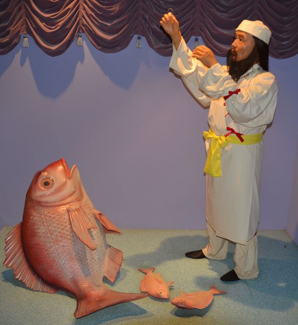 Lorsqu'il apprit la nouvelle de la bouche de sa fille, le dieu des mers rassembla tous les poissons de l'océan dans l'espoir de retrouver le filet jadis perdu. Mais les poissons confièrent au dieu de la mer que la dorade n'était pas là car elle souffrait d'une blessure à la bouche. On convoqua alors la daurade qui avait avalé le fameux filet de pêche. Filet que récupéra le dieu de la mer (ci-dessus)