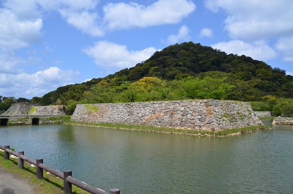 Le château de Hagi (aussi connu sous le nom de Château de Shizuki) est donc construit au pied du Mont Shizuki (ci-dessus), ce qui est plutôt inhabituel, et obligera Terumoto à bâtir des murs de protection sur une importante longueur autour du Mont. Une citadelle sera aussi érigée au sommet. Je choisirai de terminer ma visite en gravissant les 143 mètres de cette colline boisée et découvrirai à mon arrivée les restes de ce qui était une place forte qui dominait les environs. Le château sera construit en trois ans et huit mois mais sera détruit en 1874 après que le seigneur Takachika Mori ait transféré sa résidence à Yamaguchi. Il n'en restera que des ruines qui sont aujourd'hui magnifiquement préservées (ci-dessous).
