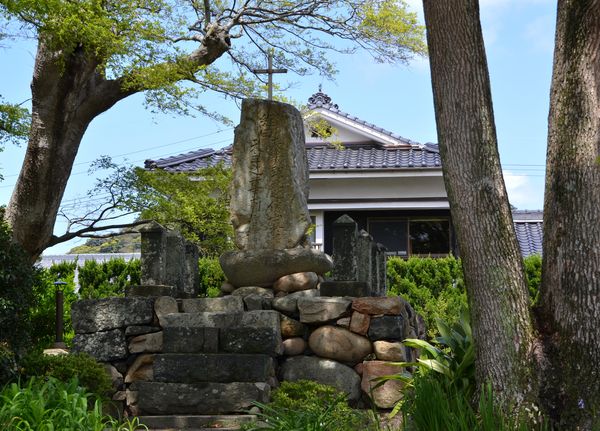 A dix minutes de marche de là, je me rends au mémorial des martyrs catholiques d'Hagi (ci-dessous): On découvrit peu de temps avant la restauration Meiji quelques 3000 corps de chrétiens dans le village de Nagasaki ( qui est aujourd'hui devenue la ville du même nom à Kyushu). La religion catholique avait longtemps été interdite dans ce pays et l'on contraignit les Chrétiens à s'exiler et à expier leur foi. 300 chrétiens arrivèrent ainsi à Hagi et 40 d'entre eux moururent de faim dans des conditions abominables. Le Père Villion sera le premier missionnaire catholique à s'installer à Hagi en 1895 pour y créer un nouveau centre d'apostolat. Dans son ouvrage, il parle d'ailleurs de 180 chefs de famille exilés dans cette ville en juillet 1868. Avant d'ériger ce monument à la mémoire des martyrs d'Hagi, monument dont la base fut construite avec les pierres qui constituaient les murs de la prison de ces pauvres hommes. Un autre japonais, est lui aussi commémoré au même endroit: Kumagai Motonao, personnage important du clan Mori, fut lui aussi martyrisé pour sa croyance (Edo, 1605).