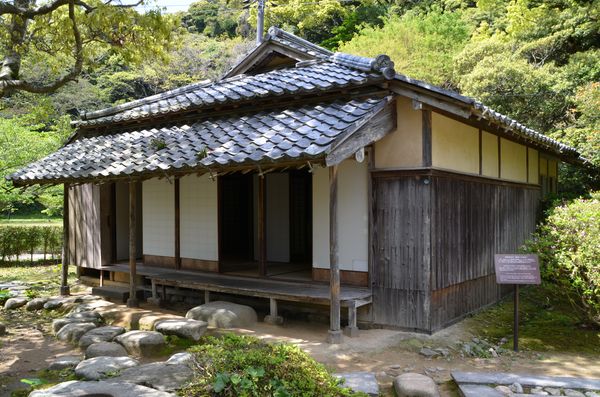 Le parc accueille aussi le salon de thé de la famille Nashiba (ci-dessous) appelé « Nashiba-ke chashitsu ». Juste quelques mètres plus loin, s'élève une autre maison au toit de chaume (deuxième photo): La maison de thé Hananoe. Celle-ci fut construite en 1845 autour du Palais du même nom qui se dressait alors le long de la rivière Hashimoto. Il est l'œuvre de Takachika Mori, le 13 ème seigneur du clan Mori. Fils de Narimoto Mori et d'une concubine, il vécut un règne riche en évènements avec le bombardement de Shimonoseki, l'affaire Ikeyada, la rébellion de Hamaguri, la première expédition de Choshu, puis la seconde, l'alliance Satcho et la guerre de Boshin. Il s'entourera de Murata Seifu (samouraï japonais qui fut un important réformateur de la période Edo), de Tsuboi Koemon et de Sufu Masanosuke afin de réformer l'économie et l'administration de son clan. Et il est fort à parier qu'à l'époque, certains entretiens se soient déroulés dans la maison de thé Hananoe qui est supposée avoir abrité plusieurs réunions politiques entre les seigneurs et leurs vassaux vers 1860. La maison fut racheté en 1889 par Yajiro Shinagawa puis fut déplacée sur son lieu actuel.
