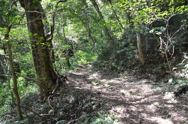 Une promenade dans le parc de Shizuki est très reposante et je me laisse aller à suivre ce sentier qui va me mener au sommet du Mont Shizuki. Le sentier est ardu mais agréable et boisé (ci-dessous). Je croise sur ma route un monument matérialisant les restes du sanctuaire Kotoku qui fut bâti en 1762 par Shigetaka Mori, 7 ème seigneur du clan. Les ancêtres du clan Mori y étaient enterrés et reposent toujours aujourd'hui sous une stèle de pierre portée par une grosse tortue. Le Mont Shizuki s'élève à quelques 143 mètres mais n'offre pas une vue imprenable sur les environs car la panorama est caché de toutes parts par les arbres. C'est dommage!