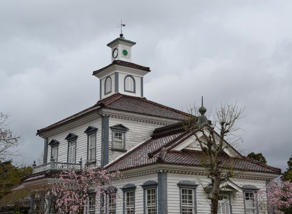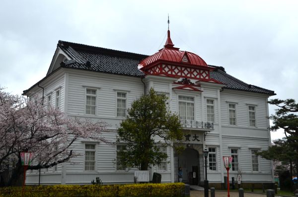 Je me rends dès 9h30 ce samedi au petit bureau de tourisme situé près de la gare ferroviaire. La dame ne parle que japonais mais arrivera à comprendre que je souhaite visiter Tsuruoka et qu'il me faut quelques informations. Elle me trouvera un plan de la ville en anglais (ce dont mon hôtel ne disposait pas) ainsi que quelques autres brochures. Le parc de la ville est excentré de la gare (à moins que ça soit l'inverse!) et je devrai emprunter le bus pour m'y rendre car c'est autour de ce parc que se trouvent les curiosités principales de la cité. Une dizaine de minutes suffisent pour atteindre ma destination: Sur place, les cerisiers sont en fleurs (le Tohoku fête actuellement le printemps, en retard sur tout le reste du pays!) et un groupe d'élèves formant un orchestre se prépare à célébrer une cérémonie dont eux seuls ont le secret. Les Japonais aiment l'eau (encore une chance avec le temps qu'il fait!) et sont sortis ce matin en nombre, armés d'un parapluie. Mon attention est tout de suite attirée par un bâtiment, le Taihokan (ci-dessous). Cette bâtisse fut construite afin de commémorer l'arrivée sur le trône de l'empereur Taisho, appelé habituellement Yoshihito (qui sera le 123 ème empereur du Japon). La construction sera achevée en octobre 1915 et inaugurée le 10 du mois suivant ( le jour de la cérémonie du trône). Taihokan provient d'un vieux livre chinois, Ekikyo. C'est tout ce que l'on apprend de la brochure qui m'est remise dans la langue de Shakespeare. Le bâtiment ressemble à une construction de type occidental du début de l'ère Taisho agrémentée d'une architecture baroque, sur deux niveaux, et son coût total s'éleva à 12861 yens de l'époque. D'abord utilisé comme bibliothèque, musée et lieu d'assemblée, jusqu'à ce que la bibliothèque ne déménage dix ans plus tard...avant de réintégrer ce lieu devenu populaire auprès des habitants, de 1951 et 1985. La maison possède un certain charme avec ses murs de couleur blanche et son toit rouge et fut désigné comme bien culturel important de la ville en 1981. Une nouvelle bibliothèque fut plus tard construite et le Taihokan rénové pour devenir un musée, depuis 1989, rassemblant différents objets et documents historiques sur Tsuruoka.