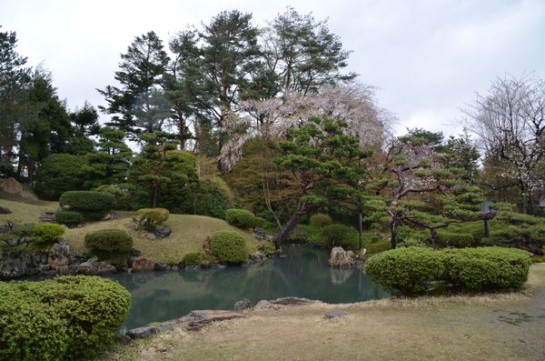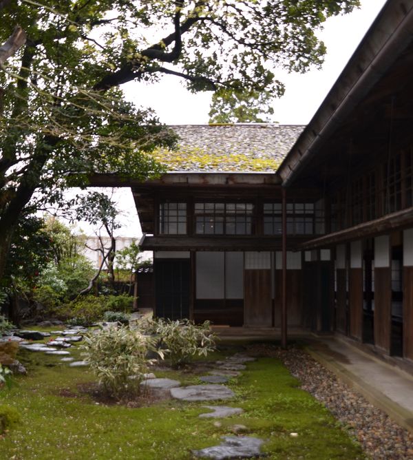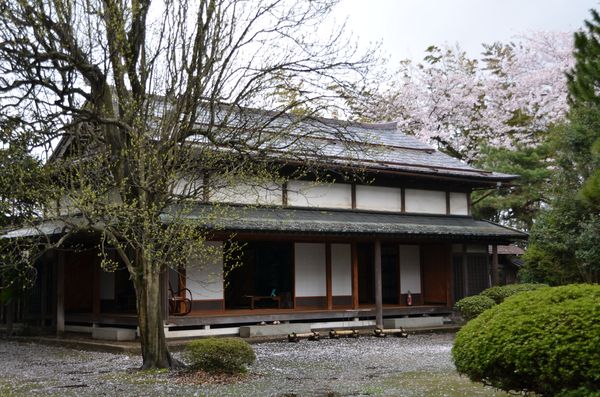 La même famille possédait une autre demeure, toute proche: Muryoko-en Shaka-do (ci-dessous). On surnommait cette résidence «Villa de l'infinie lumière ». Celle-ci était surtout destinée comme lieu de loisirs pour les visiteurs de la famille Kazama. La construction a été conçue sur le modèle d'une maison de thé et a été érigée en 1910, en bois de pin japonais. Désignée, elle aussi, depuis comme bien culturel national (en février 2002), elle est représentative du style architectural de la préfecture de Yamagata. Koemon, le huitième seigneur, avait baptisée cette demeure du nom de « Muryoko-en » car il croyait beaucoup en la secte bouddhiste de la terre pure et représentait ainsi l'image du dieu Amitabha Tathagata (le dieu qui apporte la lumière à l'infini). Un jardin de 2700 m² avec fleurs et arbres comme ces cerisiers Yoshino bicentenaires, ou bien des azalées. Je n'arrive pas au bon moment pour admirer ce jardin dans toute sa splendeur car le meilleur moment est à la mi-mai, à l'époque de la floraison des azalées blancs le long de la petite colline (tsukiyama).