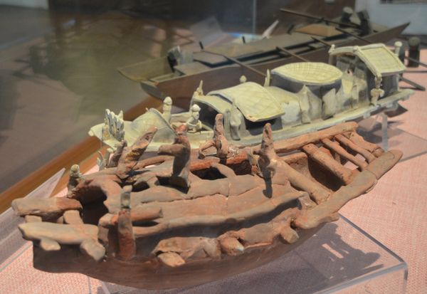 A la fin de la dynastie des Qin, le souverain local Zhao Tuo unifiera les préfectures de Guilin et de Xiang pour établir le Royaume des Nanyue qui aura pour capitale la vieille ville de Panyu. Puis se couronnera lui-même du titre de Prince Wu. Panyu sera ainsi tour à tour capitale du royaume Nanyue, puis capitale de la province de Guangdong sous la dynastie des Han et enfin siège de la Préfecture de Guang en 226. Et les Han (ethnie majoritaire) et les Yue (ethnie minoritaire) de cohabiter en paix tout en développant fortement le commerce et les techniques d'architecture. Sous le règne de l'empereur Wu (de 140 à 87 avant J.C), durant la dynastie des Han de l'ouest, d'importantes flottes de navires chinois prenaient la mer au départ du port de l'actuelle Guangzhou pour se diriger vers le sud-est et le sud de toute l'Asie. Ces flottes atteindront même plus tard le Golfe Persique (sous le règne des Han de l'est, de 25 à 220 après J.C). Sous le règne des Han de l'est, il existait aussi des bateaux de transport de marchandises qui naviguaient sur les rivières intérieures (comme sur cette photo ci-dessous, ce bateau fait de poterie, qui fut exhumé de Honghuagang en 1954). Cette période durant laquelle le commerce international va bon train, est attestée grâce aux nombreuse marchandises retrouvées dans les sépultures des périodes Han: Cornes de rhinocéros, brûleurs d'encens, vaisselles, ornements faits de perles et d'ivoire...Cette cité qui allait devenir Guangzhou était déjà à l'époque un grand port du sud de la Chine ancienne et le point de départ de la Route de la soie.
