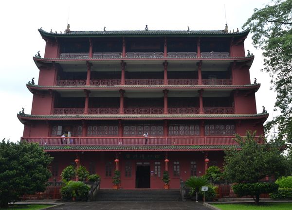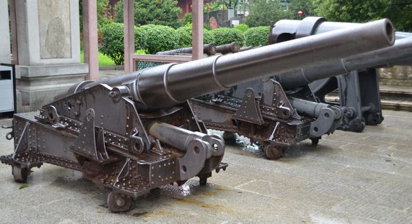 Guangzhou essuie à cette époque de l'année des orages à répétition. Quotidiennement, à partir de la mi-journée, il est fréquent de voir tomber des rideaux d'une pluie chaude qui vous fait l'effet d'une douche en quelques minutes. Mieux vaut avoir sur soi un parapluie. C'est ce que j'ai fait en sortant de mon hôtel pour me diriger cette fois vers le musée de Guangzhou, situé dans le parc Yue Xiu. Fondé en 1929, ce musée fut le premier musée d'histoire généraliste locale en Chine. On y trouve une exposition permanente sur l'histoire de la ville, en remontant 5000 à 6000 ans en arrière. Abritée à l'intérieur du Pavillon de Zhenhailou (en photo ci-dessous), cette exposition permet d'admirer mille objets sur cinq niveaux. Je n'explorerai cette fois que les trois premiers niveaux de ce bâtiment considéré comme le premier pavillon au sud des « cinq montagnes ». Une visite ultérieure nous permettra de découvrir les us et coutumes de Guangzhou. Le musée comprend non seulement le Pavillon de Zhenhailou mais aussi le Pavillon de Meishuguan, le mémorial de la guerre contre le Royaume-Uni menée par le peuple de Sanyuanli et le mémorial de l'ancien siège du poste de commandement d'insurrection « 3-29 ». Revenons pour l'instant sur le Pavillon de Zhenhailou: L'architecture antique du lieu évoque la vieille ville des dynasties Ming et Qing. Zhenhailou est aussi surnommé « Wanghailou (le pavillon pour regarder la mer), ou bien le « pavillon à cinq étages ». Construit la treizième année du règne Hongwu de la dynastie Ming, c'est à dire en 1380, ce pavillon fait partie d'un plan de construction mis au point par le Général Zhu Lianzu alors chargé de la défense de Guangzhou. Celui-ci avait décidé d'agrandir la ville en construisant des murailles au nord de celle-ci (murailles traversant la montagne Yue Xiu) et en bâtissant le pavillon de Zhenhailou en son sommet. Depuis ce pavillon, on peut en effet profiter d'une vue d'ensemble sur la ville. L'endroit attira également poètes et gens de lettres venus exprimer leur admiration sur ce lieu il y a plusieurs centaines d'années. L'endroit sera d'ailleurs classé au premier rang des attractions de Guangzhou sous la dynastie Qing. La partie est du pavillon est utilisée pour accueillir les expositions temporaires tandis que la partie ouest abrite une galerie de documents historiques sous la forme de stèles ainsi que les canons de défense de la dynastie Qing. On peut ainsi voir ci-dessous (deuxième photo) un canon avec carabine intégrée qui fut conçu par la firme allemande Krupp. Fixé autrefois sur un rail annulaire, l'engin était capable d'ajuster son angle de tir et possédait deux calibres: Celui de 22 cm, fondu en 1897, servait à défendre le Fort de Xieshan à Huanpu lors de la guerre sino-japonaise en 1894. L'autre, de 12,5 cm, fut fondu en 1887, dix ans auparavant.
