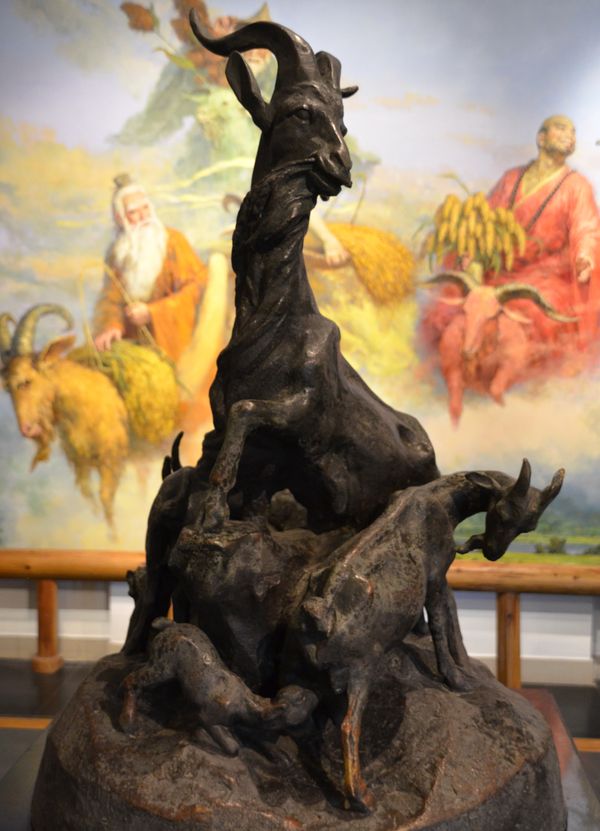 Aujourd'hui capitale de la province du Guangdong, Guangzhou reste le berceau d'un mythe et d'une longue civilisation. Au rez-de-chaussée du pavillon de Zhenhailou, se trouve sur la droite la statue des cinq chèvres (ci-dessous), une pièce originale que l'on doit à Yin Jichang, Kong Fanwei et Chen Benzong, sculpteurs cantonnais, qui la réalisèrent en 1959 d'après un mythe local. On prétend en effet qu'il y a très longtemps, cinq fées, juchées sur cinq chèvres, survolèrent la ville et offrirent cinq brassées de maïs aux habitants, garantissant à jamais la fertilité des terres. Puis, ces mêmes fées s'évanouirent dans le firmament tandis que les chèvres, elles, se figèrent dans la pierre. D'où le surnom de Guangzhou: La ville des chèvres, ou « ville du maïs ».