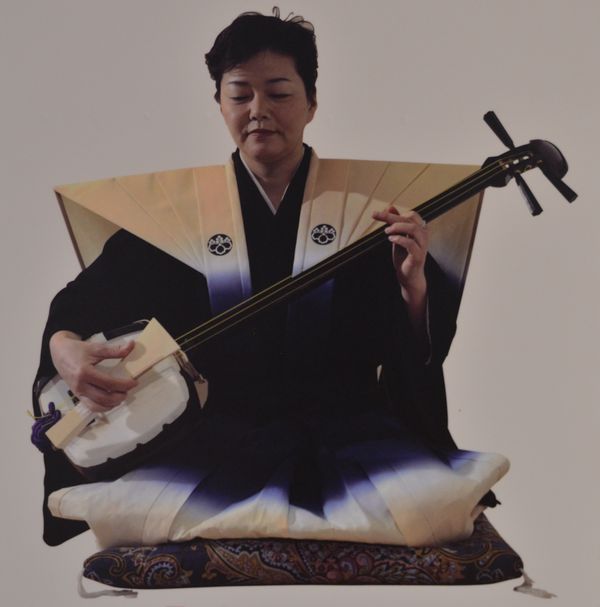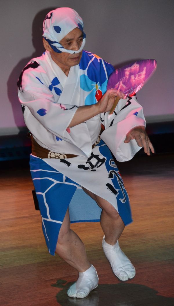 Quoiqu'il en soit, il n'y a pas de danse sans musique (ci-dessous) et les instruments participant au spectacle sont au nombre de six: On trouve le shamisen (instrument à cordes), le kane (sorte de cloche qui ouvre le danse), la flûte de bambou yokobue, le tsuzumi (sorte de tambour), le shimedaiko (un autre tambour produisant un ton élevé) et l'oodaiko (qui produit un son grave). Des séquences de danse sont exécutées durant une quarantaine de minutes et viennent entrecouper les explications données par notre animateur. La salle est attentive et les applaudissements fusent à la fin des différentes danses.