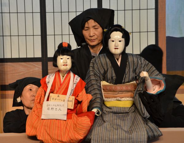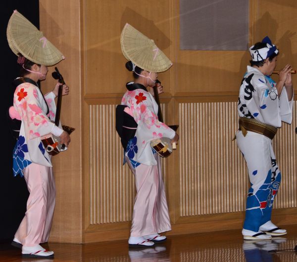 Le théâtre Awa est synonyme de tradition dans la région depuis presque 400 ans. On y raconte des histoires au son du shamisen (ci-dessous) pendant que les marionnettistes s'activent pour donner vie à leurs personnages (deuxième photo). Ces trois personnages (le narrateur, le musicien et le marionnettiste) sont indissociables. Cet art théâtral avait jadis pour habitude de se transporter dans les villages reculés (en montagne ou à la campagne). Des scènes spéciales (nosonbutai) étaient alors utilisées, tant pour les pièces de kabuki que pour ces spectacles de marionnettes. En 1971, on comptait encore 208 théâtres itinérants de ce type. Des portes en bois coulissantes (fusumae) étaient utilisées pour les décors car facilement amovibles. La scène du théâtre la plus spectaculaire faisant usage de ce système à Tokushima comprenait 130 fusumae et laissait apparaître 42 décors différents.