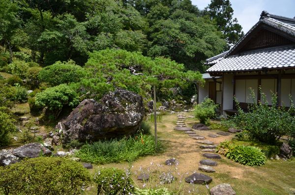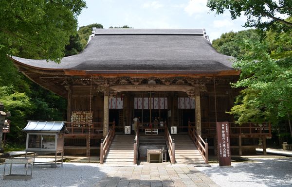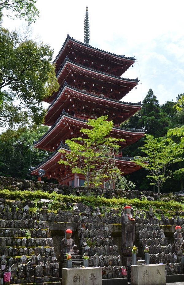 Le Hall principal (ci-dessous) fut construit en 1644 par Yamauchi Tadayoshi, le deuxième lord de Tosa. Il lui donna le nom de Monjudo car le bâtiment accueille Monju Bosatsu. C'est la plus ancienne construction sur cette colline et elle est aujourd'hui classée comme bien culturel important. L'auberge, elle, fut érigée au XVII ème siècle par les lords du domaine de Tosa. La pièce principale fut conçue dans le style architectural shoin correspondant à la période Muromachi. Le toit de l'entrée est de style chinois et se marie harmonieusement avec les autres types de toits de l'ensemble. Le hall Daishi-do (deuxième photo) abrite Kobo-daishi, connu aussi sous le nom de Kukai, ou encore Gyoki, ce prêtre qui fonda le temple Chikurinji. La simplicité de ce hall contraste avec la richesse du grand hall. La construction date de 1644 et est également due au deuxième lord de Tosa, Yamauchi Tadayoshi. Il y a longtemps, les pèlerins avaient pour habitude de clouer des tablettes en bois sur la partie horizontale de la charpente. Ces tablettes sont encore visibles de nos jours. Le temple Chikurinji offre aussi un magnifique jardin créé par Muso-kokushi, un moine bouddhiste zen qui fut un dessinateur connu de la période Kamakura. Celui-ci vint à Tosa, puis se construisit un ermitage , Gyuko-en, au pied du Mont Godaisan, en 1318. Le jardin (troisième photo) est de style japonais avec son bassin, et un paysage escarpé entourant l'auberge. Il compte parmi les trois plus beaux jardins de la préfecture de Kochi, et décrocha le titre de beauté scénique nationale en 2004. La salle des trésors (à côté de l'auberge) est un point obligé de cette visite: Le hall rassemble 17 images de Bouddha datant des périodes de Fujiwara, de Kamakura, s'étalant des IX ème au XIV ème siècles. Terminons par la pagode à cinq étages: La pagode d'autrefois n'en comportait que trois, et il fallut le typhon destructeur de 1899 pour que cette construction soit mise à bas et pour qu'on reconstruise une nouvelle pagode comportant cette fois cinq étages. Le style du XIII ème siècle a toutefois été préservé et le bois utilisé est du cyprès japonais. Cette pagode abrite un petite bout d'os du Bouddha qui fut envoyé depuis Buddhagaya (Inde) ainsi qu'une image de Dainichi Nyorai qui se trouve à l'intérieur du premier étage.
