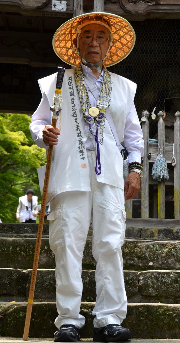 Tout près du jardin botanique (c'est à dire à cinq minutes de marche de son entrée sud) se trouve le temple Chikurinji (ci-dessous). Ce temple bouddhiste de la secte Shingon est le 31 ème temple du pèlerinage de Shikoku (qui en compte 88). Nous rencontrons en cours de route un pèlerin (deuxième photo) faisant partie d'un groupe. Notre présence le surprend et nous échangeons quelques mots dans une grande convivialité. Il est vrai qu'on ne voit pas beaucoup de « visages pâles » par ici. Ce temple fut bâti par le prêtre Gyoki sur ordre de l'empereur Shomu en 724 et fut dédié à l'image de Monju Bosatsu. On dit que cet empereur avait fait le rêve d'escalader le Mont Godaisan , le site sacré de Monju Bosatsu, dieu de la sagesse. C'est ainsi que fut érigé ce temple, sur le modèle de celui qui existait déjà à Godaisan (Chine). Le prêtre partit à la recherche du site idéal au Japon, site qu'il trouva à Kochi. Il érigea le temple et sculpta lui-même l'image de Monju Bosatsu. Plus tard, au IX ème siècle, Kobo-Saishi, le fondateur de la secte Shingon, visita le temple lors d'un pèlerinage sur l'île de Shikoku. C'est à la suite de son passage que ce temple fut déclaré 31 ème temple du fameux pèlerinage. Durant la période Edo, le temple profitera des nombreux patronages des lords féodaux attachés au domaine de Tosa. Et fera de sa pagode et de ses halls une fierté. Les moines y viendront pour étudier , transformant ce lieu en une référence religieuse et culturelle. Une chanson populaire, Yosakoibushi » évoque même l'histoire d'amour entre une jeune fille, Ouma, et un prêtre nommé Junshin (qui vécut au temple à la fin de la période Edo).