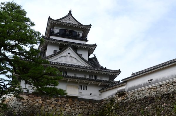 Des douves, alimentées par les rivières Kagami et Enokuchi, protégeaient le château. Celui-ci, construit dans le style hirayamashiro, offre un donjon de cinq étages, qui en comporte en réalité six de l'intérieur (visible sur la photo ci-dessous). Le palais intérieur, lui, fut bâti dans le style shoin durant la période Edo. L'endroit offre un salon de thé dans l'entrée, des latrines, mais aussi huit chambres traditionnelles et est ceint par une véranda sur les façades sud et est. Ce château fut par ailleurs choisi à plusieurs reprises pour y tourner des films.