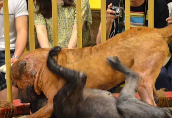 A Katsurahama, je m'arrête quelques instants au Centre de combats de chiens de Tosa. Ces combats sont très populaires au Japon. La tradition est particulièrement forte dans le quartier de Tosa (Shikoku) depuis l'ère Hojo. On utilise pour ces combats des chiens réputés pour leur résistance et leur courage. Ces combats servaient autrefois aux guerriers samouraïs à observer la façon qu'avaient les animaux de se battre pour adapter eux-mêmes ensuite leur propre technique de combat. Le combat de chien de Tosa est très similaire à un combat de sumo et obéit d'ailleurs à des règles similaires: Les chiens Tosa portent des robes de cérémonie pouvant coûter jusqu'à 30 000 dollars. Les deux chiens sont placés l'un en face de l'autre, à l'intérieur d'un anneau de dix pieds de diamètre. A leurs côtés, se trouvent un juge, deux assesseurs et au moins trois examinateurs. Le combat ne dure généralement pas plus de dix minutes. Un chien qui aboie , qui gémit, s'enfuit ou qui émet un grognement est immédiatement disqualifié. Le combat peut se terminer par K.O si un chien ne se relève pas. Le vainqueur n'est pas forcément celui qui attaque l'autre avec le plus d'acharnement mais celui qui fait preuve d'esprit combattant. On n'utilise pour ces combats que des chiens de sexe mâle (les chiens femelles, elles, sont plutôt utilisées pour garder la maison). Tout comme les sportifs, les chiens sont soumis à un régime strict. Ils doivent régulièrement pratiquer une activité sportive (comme courir au moins 15 kilomètres par jour) pour finalement ne combattre que deux ou trois fois par an. Le chien le plus « talentueux » est élevé au rang de Yokozuna. J'assiste quelques instants à l'un de ces combats (ci-dessous) qui se déroule à l'intérieur d'un ring protégé par des barrières en bois. Après le combat, je visite le musée qui présente des documents et des photos évoquant l'histoire des chiens de Tosa (deuxième photo). On peut ainsi observer une niche, ou bien des colliers à chiens (troisième photo). Des trophées sont offerts en fonction du classement des chiens: Le grand champion porte le titre de Yokozuna tandis que le deuxième vainqueur se voit décerner le titre de Ozeki. Les habitants de Kochi ont toujours essayé de rendre leurs chiens les plus forts du monde. Ces derniers sont connus pour leur caractère loyal, leur intelligence, leur bravoure et leur calme. Un temps disparus pendant la seconde guerre mondiale, ces chiens sont depuis réapparus à Kochi où l'on en compte maintenant environ 400. Le chien Tosa est un chien massif, à la tête large et au museau modérément long. Ses mâchoires sont puissantes et son cou musclé. Les pattes sont épaisses. Le poil de l'animal est court , dense et dur. Fidèle, il réagit bien au ton de la voix, mais n'est pas pour autant un chien bruyant. C'est un animal protecteur, courageux et intrépide.