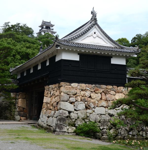 Notre voyage nous conduit cette fois à Kochi, située dans la préfecture du même nom. De nombreuses attractions nous y attendent dont ce château perché sur la colline d'Otakasa. Deux tentatives avortées de fortification du site eurent lieu avant son édification en 1601: La première fut tentée par Otakasa Matsuomaru à la fin de l'époque Heian, et la seconde, par Chozokabe Motochika, le conquérant de Shokoku, en 1588. La zone autour de cette colline était autrefois marécageuse dû à l'afflux de sédiments déposés par la rivière Kagami. Kazutoyo Yamauchi prit le contrôle de la province de Tosa suite à la victoire de Tokugawa lors de la bataille de Sekihagara, en 1600. Il décida à ce moment-là d'ériger ce château et dix ans de travaux furent nécessaires pour sa réalisation complète. Cet endroit avait été privilégié par rapport à Urado )où se trouvait déjà la résidence du daimyo) compte tenu de ses meilleures positions défensives. Le château brûla cependant en 1727 et sa reconstruction ne s'achèvera qu'en 1753. Malgré d'importantes rénovation dans les années 1950, cette forteresse est connue pour être l'un des douze châteaux japonais restés intacts à ce jour (l'ensemble des édifices intérieurs, dont le donjon et le palais sont intacts, peut être parce qu'il ne s'y est jamais déroulé aucune bataille!). L'endroit a été classé bien culturel national en 1950. La porte principale de la forteresse, Otemon (en photo ci-dessous) est, elle aussi, en bon état et comporte sur son devant une petite place prévue pour combattre. Les grosses portes en bois ont été renforcées par des plaques de cuivre qui embellissent l'ensemble.