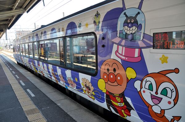 C'est encore à une journée caniculaire que nous nous préparons aujourd'hui en ce milieu de matinée. Notre périple nous conduit cette fois à Ozu, petite localité située à quelques kilomètres d'Uchiko. Celle-ci est surnommée la petite Kyoto d'Iyo (l'ancien nom de la préfecture d'Ehime) à cause de ses vieilles maisons (lesquelles m'impressionneront cependant moins que celles d'Uchiko). Notre train express (ci-dessous) quitte Matsuyama à 11h23 et atteindra Ozu trente-cinq minutes plus tard. Les paysages montagneux défilent bientôt sous nos yeux et le train s'engouffre dans une série de tunnels plus ou moins longs. Ozu se développa dans la vallée D'Hiji et autour de son château qui est petit mais bien orienté, en hauteur et à un endroit stratégique. Nous obtiendrons l'indispensable documentation touristique grâce à l'employé de gare qui contrôle nos billets. Fort sympathique, il fait aussi office d'agent touristique. Je suis agréablement surpris de constater qu'à Ozu, les panneaux indicateurs sont écrits en japonais et...en anglais, ce qui facilite l'orientation. La brochure qu'on nous remet est aussi rédigée en langue anglaise et semble très complète. Il nous faudra marcher une vingtaine de minutes afin de nous rendre au cottage Garyu Sanso. La chaleur étouffante n'augure rien de bon. Heureusement, on nous signale le passage d'un petit autobus local. Nous le prenons et saluons ses passagers, des personnes âgées essentiellement. Pour 100 yens, ce petit bus nous mènera à proximité de la rue Ohanahan avec ses vieilles maisons.