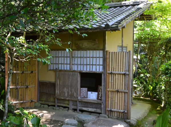 Je demande mon chemin à un homme qui traverse la rue et il nous propose gentiment de nous conduire au fameux cottage. Nous ne nous trouvons qu'à cinq minutes de marche de l'endroit. La maison au toit de chaume (ci-dessous) fut bâtie sur les flancs de la rivière Hiji et offre un lieu de villégiature unique. Celle-ci servit longtemps de retraite pour les lords féodaux et ce, jusqu'à la fin de la période Edo. N prétend que la maison fut appelée « Garyu » par le troisième lord féodal Yasutsune Kato car il trouvait que la colline Horai, toute proche, ressemblait à un dragon accroupi. Kanbe Watanabe, le bras droit de Takatora Todo, fut à l'origine de la création du jardin et Yasutsune Kato y transplanta des cerisiers de Yasuno et des érables de Tatsuta. C'est dans ce jardin que les lords venaient se détendre. Le lieu tombera dans l'oubli à la suite de la restauration Meiji, mais devra son salut à un riche marchand, Kochi Torajiro, qui demandera à un charpentier local , Nakano Torao, de reconstruire l'endroit selon ses goûts. Un artisan de Kyoto, Senke Jissoku, sera aussi convié à cette restauration. Cette dernière débuta en 1903 et dura quatre années. L'aménagement des pièces intérieures fut, dit-on, conçu sur le modèle de la villa impériale Katsura, de la villa villa impériale Shugakuin et le palais de la princesse Nashimoto. Le travail architectural est d'une redoutable précision et le résultat impressionnant, comme par exemple la sculpture de ce planfond en bois de cèdre. La structure de la maison forme un bâtiment sur un seul niveau ressemblant étrangement à une ferme. A l'intérieur, des peintures de Matsutoshi Suzuki ornent les murs. Le seuil de porte avec son bambou fendu donne l'impression de se trouver dans le jardin d'un salon de thé. Dans une pièce (kagetsu-no-ma), trois étagères en bois suggèrent la forme du brouillard. Elles sont surmontées par une fenêtre circulaire en papier washi qui laisse passer la lumière depuis le Butsuma (la pièce voisine où se trouve l'autel). On dirait la lune. On reconnaît les portes coulissantes finement sculptées par le maitre charpentier, habillées de washi et ornées d'une poignée de porte métallique en forme de chauve-souris. La véranda, elle, est faite en bois de pin de Sendaï. La pièce Seisui-no-ma offre quant à elle son haut plafond. Ses ornements sculptés représentent les quatre saisons et entretiennent une ambiance détendue. Dans le jardin, une ancienne salle de bain (troisième photo ci-dessous) fut reconvertie, en 1949, en un salon de thé. On y accède par une minuscule porte basse et une plaque qui porte les caractères « Chishi » fut rédigée par le dixième lord féodal, Yasuzumi Kato. Le papier qui servit à recouvrir les murs de ce lieu provient du journal du troisième lord féodal Yasutsune.