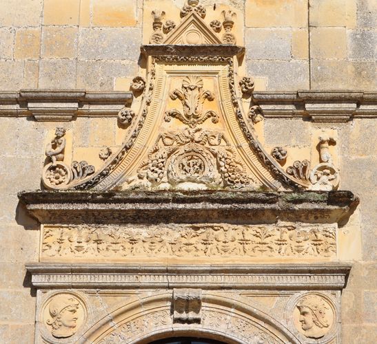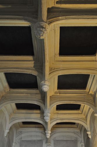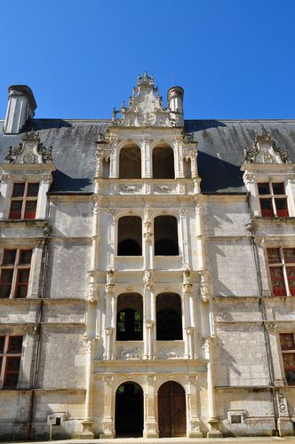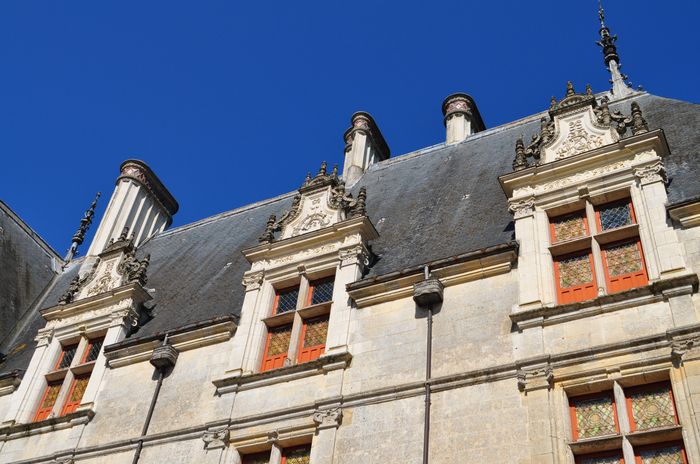 On trouve aussi un escalier d'honneur à rampes droites, desservant trois étages de baies jumelées qui forment des loggias. Un fronton ouvragé offre d'admirer plusieurs ornements de mode italienne tels que des colonnes, des pilastres, des coquilles ou des médaillons...La porte d'entrée est ornée des initiales de Gilles Berthelot et de sa femme tandis que la partie inférieure des baies est décorée de la salamandre et de l'hermine, en référence au roi François 1er et à son épouse Claude. Les volées portant le plafond de l'escalier d'honneur sont ornées de caissons (ci-dessous) encadrant des médaillons sculptés qui représentent des visages ou des bustes de personnages de profil (dont certains du XVI ème siècle) auxquels on ajouta plus tard les rois et reines de France de Louis XII à Henri IV. Ici figure un mélange d'inspiration italianisante et de style féodal (des traces d'un chemin de ronde sur les murs extérieurs ou encore des mâchicoulis sur les toits sont encore visibles le long des hautes toitures ornées de poivrières effilées et de longues lucarnes (deuxième photo ci-dessous).