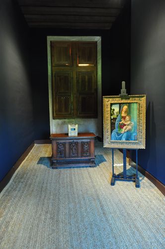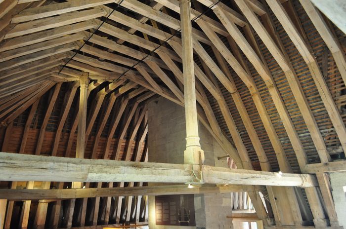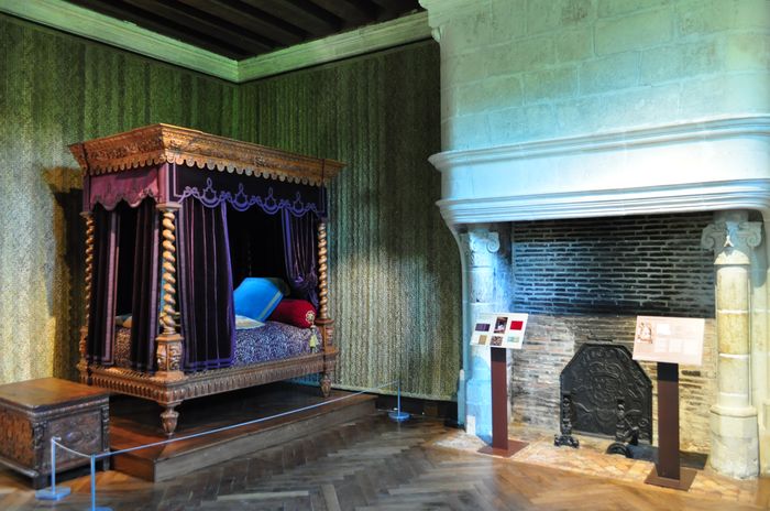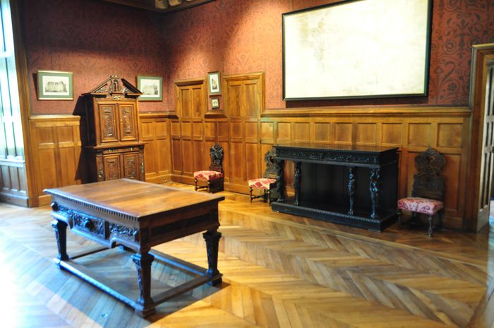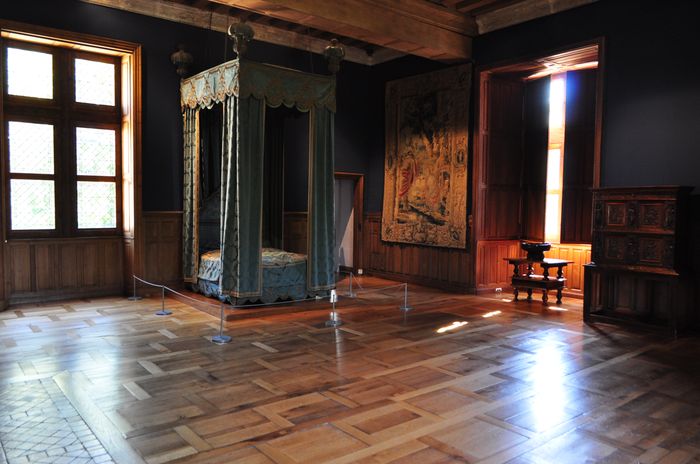 L'intérieur du château a l'apparence de la Renaissance italienne, avec de riches décors sculpturaux où l'on aperçoit encore des traces de la Renaissance flamande avec les tapisseries des XVI ème et XVIII ème siècles (photo) exposées dans plusieurs pièces du château. Il existe en effet plusieurs pièces : Je débute la visite des lieux par le premier étage où se trouve le grand comble (ci-dessous). Ce comble, dit « à surcroit » possèdent des murs qui supportent la charpente (celle d'origine était en chêne et date de 1522). Au XIX ème siècle, les combles furent cloisonnés en chambres pour les domestiques. Je pénètre ensuite dans ce qu'on appelle les espaces nobles avec la chambre Renaissance (deuxième photo) : On pense que celle-ci fut occupée par Philippe Lesbahy, l'épouse de Gilles Berthelot. Précisons que du temps de la Renaissance, Philippe était un prénom mixte couramment attribué aux femmes. L'oratoire, voisin, la troisième photo ci-dessous, évoque un lieu de prière privé et occupe une pièce qui servait sans doute de garde-robe à l'origine.