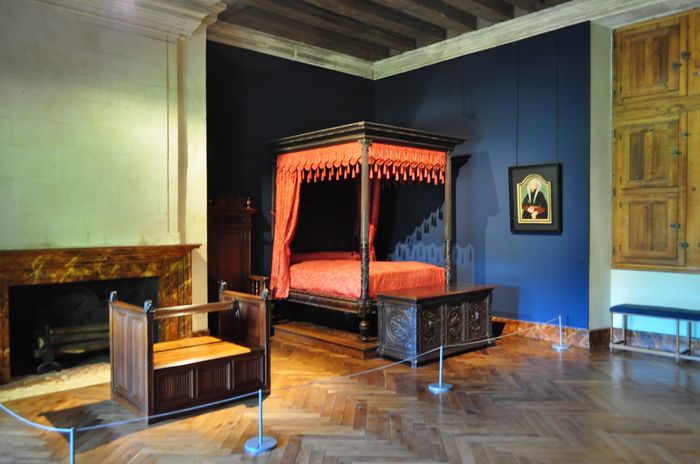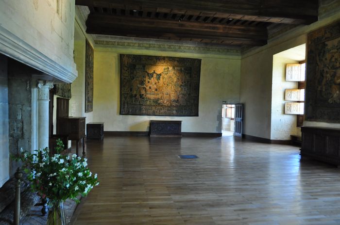La chambre du maitre de maison (ci-dessous) tait destinée à Gilles Berthelot et servait à la fois de lieu de séjour, de réception et de travail. La grande salle (deuxième photo) était quant à elle utilisée pour les bals et festins. Son vaste volume est souligné par une élégante corniche. Une grande cheminée, décorée de colonnes et pilastres, témoigne du talent des sculpteurs de la Renaissance. Et l'on peut distinguer la salamandre et une devise peintes en trompe-l'oeil sur son manteau. L'antichambre voisine (troisième photo) présente une galerie de portraits de souverains des XVI ème et XVII ème siècles. La grande chambre (quatrième photo) où devait séjourner le roi fait suite à cette antichambre : Elle fut occupée par Louis XIII en 1619 lorsqu'il vint rendre visite au seigneur d'Azay.