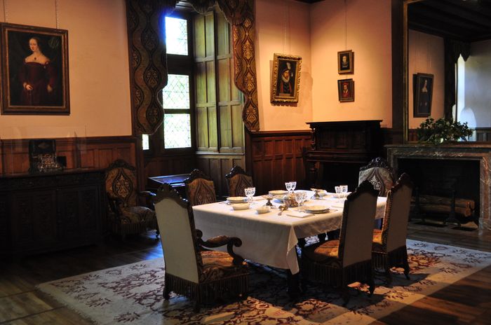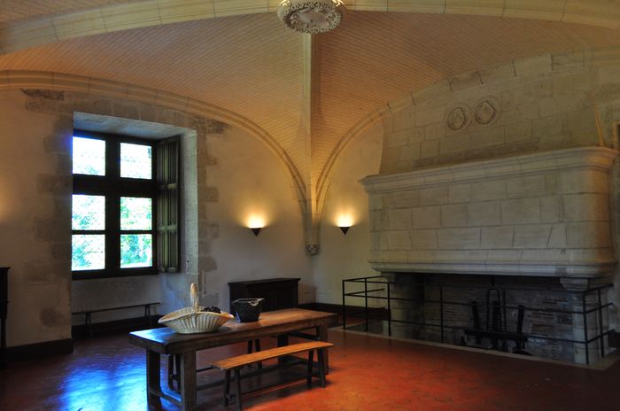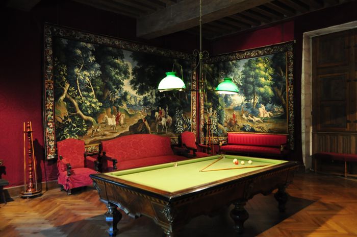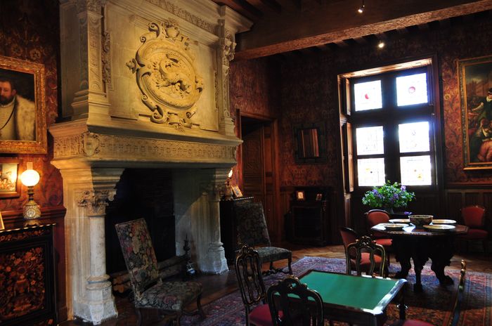 La visite du château se poursuit au rez-de-chaussée où se trouve le salon Biencourt (ci-dessous) : L'atmosphère chaleureuse du XIX ème siècle y a été recréée grâce à une importante collection de peintures, de portraits historiques et de photographies des marquis successifs et de leurs épouses. Je pénètre maintenant dans la salle de billard (deuxième photo) qui est décorée de tapisseries de la manufacture de Beauvais qui furent tissées au XVIII ème siècle et représentent des scènes de chasse. La pièce voisine s'appelle la dépense et servait de lieu de stockage et de distribution des denrées au XVI ème siècle. La cuisine (troisième photo), elle, a un sol surélevé depuis le XIX ème siècle, et a conservé son évier et sa cheminée de la Renaissance sur laquelle les blasons de Gilles Berthelot et de son épouse Philippe Lesbahy peuvent encore être observés. Cette pièce est voûtée sur croisée d'ogives et partage un puits avec la dépense.
