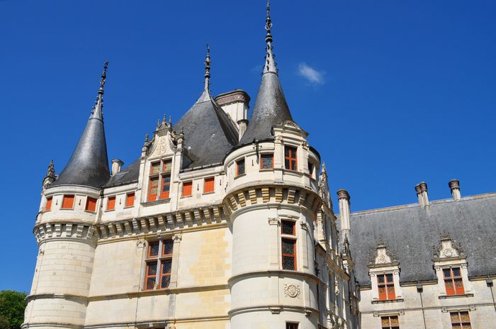 Le château est inscrit sur la liste des Monuments Historiques dès 1840, ce qui n'empêchera pas la démolition des derniers vestiges médiévaux cinq ans plus tard pour laisser place à deux nouvelles tours d'angle sur cour (photo ci-dessous). On rappellera que cette demeure fut occupée un mois durant par le prince Frédérick Charles de Prusse (alors neveu du roi de Prusse) et son état-major, les Biencourt s'étant alors réfugiés dans les parties communes de l'endroit. Balzac vint aussi y déjeuner un jour et décrivit le lieu comment un « diamant taillé à facettes serti par l'Indre ». Est-il besoin de rappeler qu'Azay-le-Rideau est l'un des châteaux les plus célèbres de la Loire ? Relativement petit, celui-ci s'articule en un corps principal et une aile en équerre (deuxième photo) entouré par l'Indre et un parc boisé. Une tourelle encadre chaque angle. Et une entrée monumentale désigne le centre du bâtiment (troisième photo).
